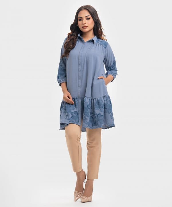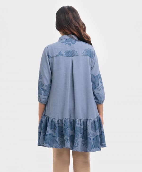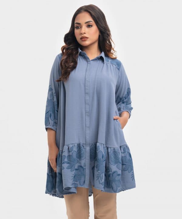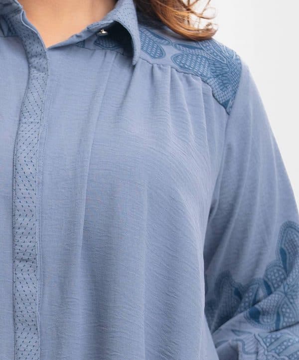Bishop sleeved shirt in blended georgette fabric. Classic collar with hidden button placket. Yoke at the shoulders and back.