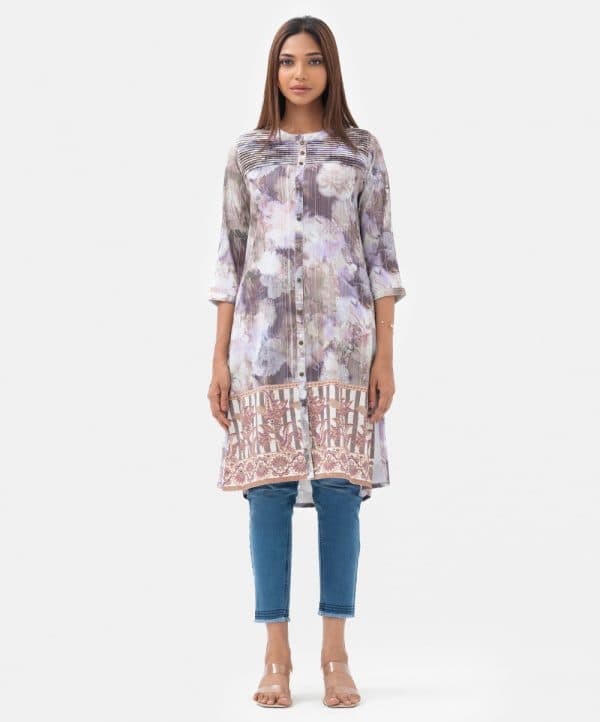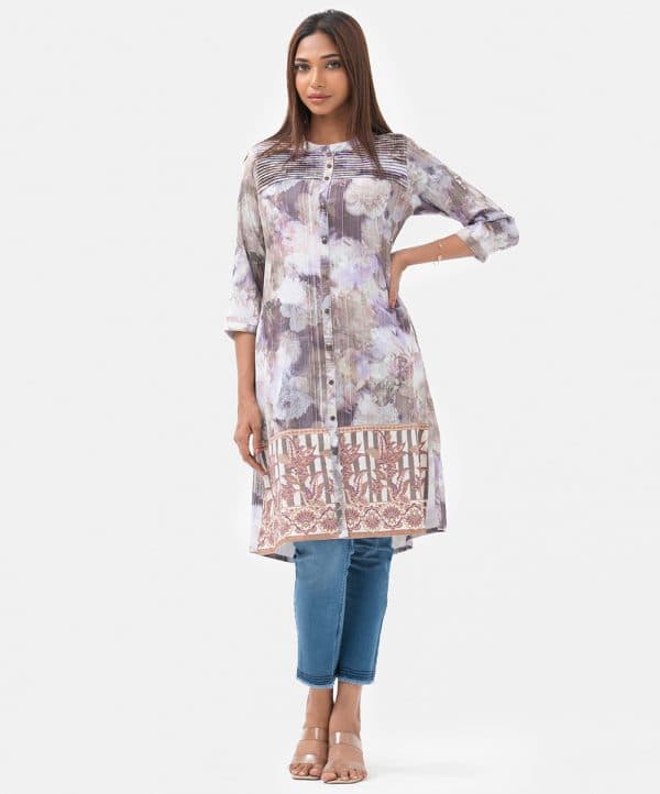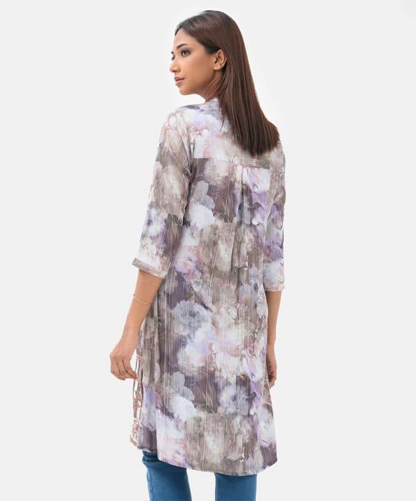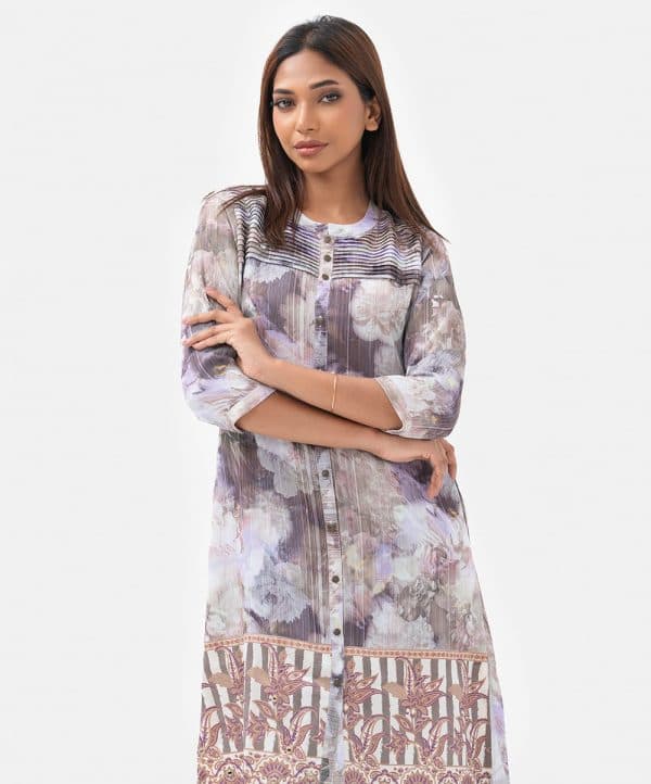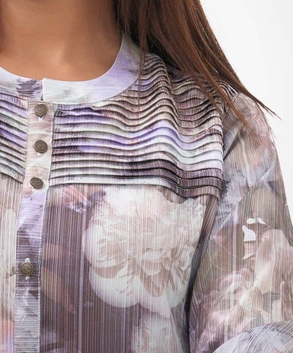 Ladies’ shirt in printed joom fabric. Stand collar, three-quarter sleeves. Buttons fastening and pintuck at front. Karchupi at hemline.