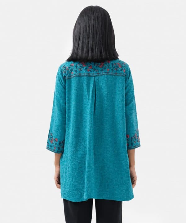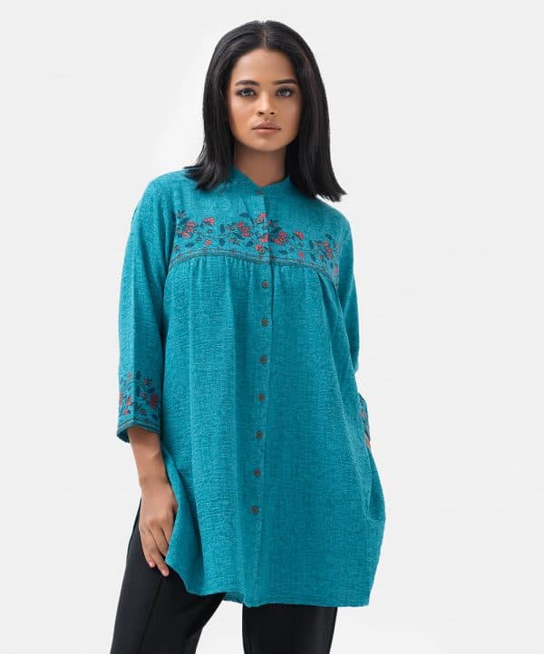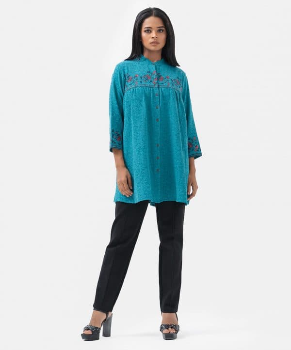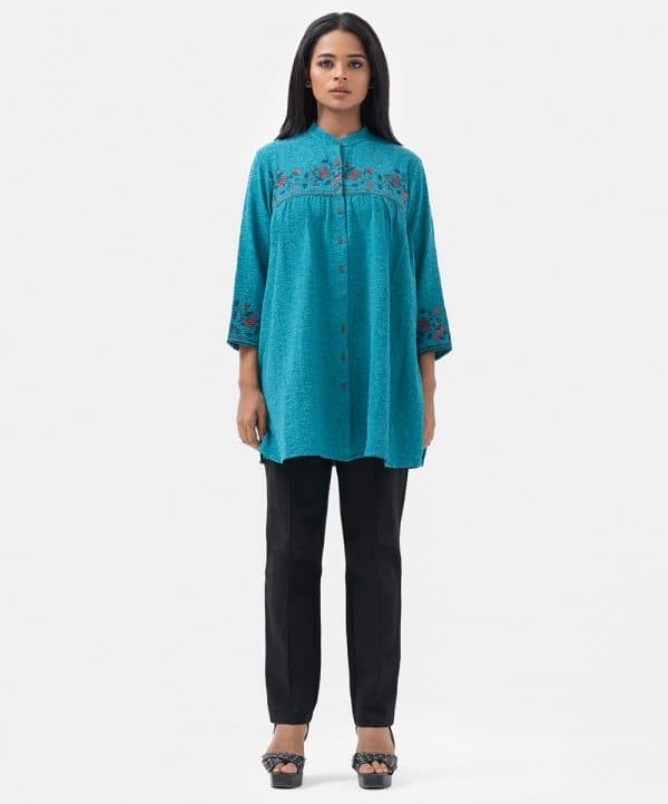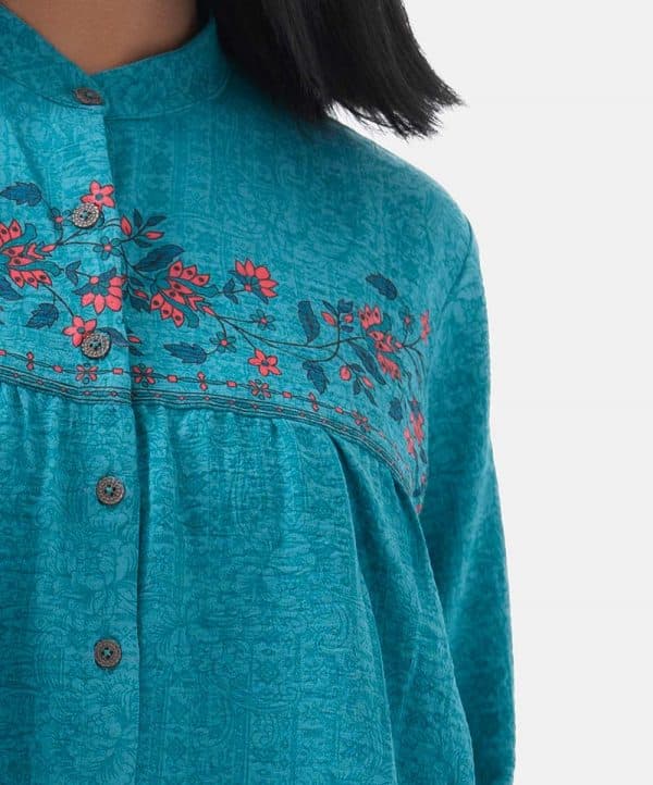 Women’s printed tent-style ladies’ shirt in georgette fabric. Stand collar, three-quarter sleeves and button fastening at the front.