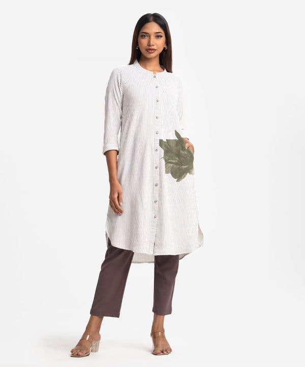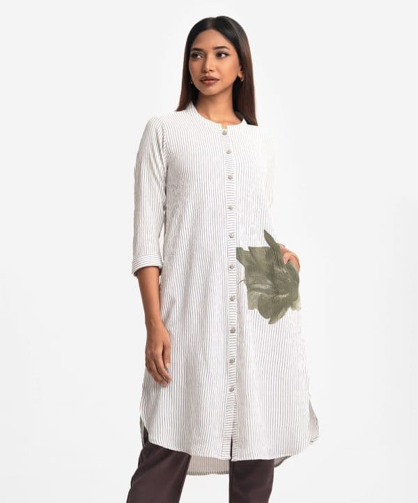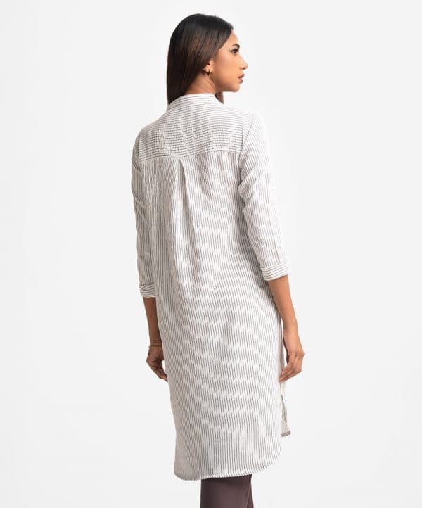 Ladies’ stripe shirt in stretchable georgette fabric. Stand collar, three-quarter sleeves. Buttons opening and inseam pockets.