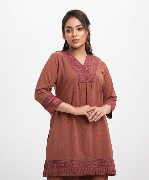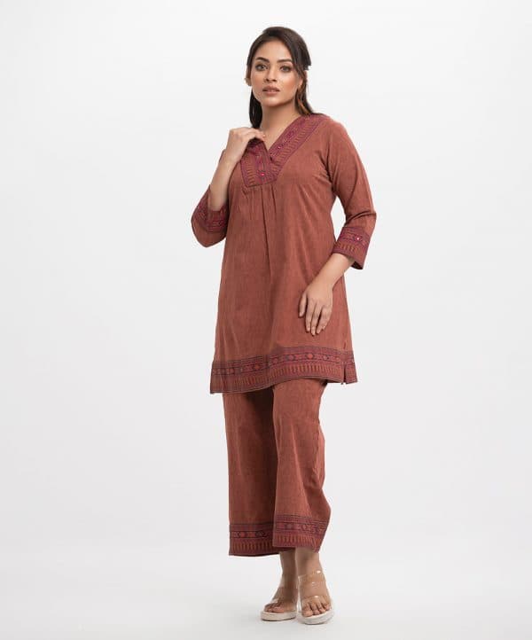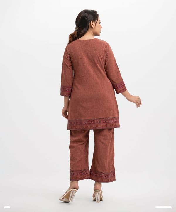 Women’s printed top bottom set in joom fabric. V-neck, bell sleeves, patch & karchupi detail tent style top. Palazzo pants as the bottom.