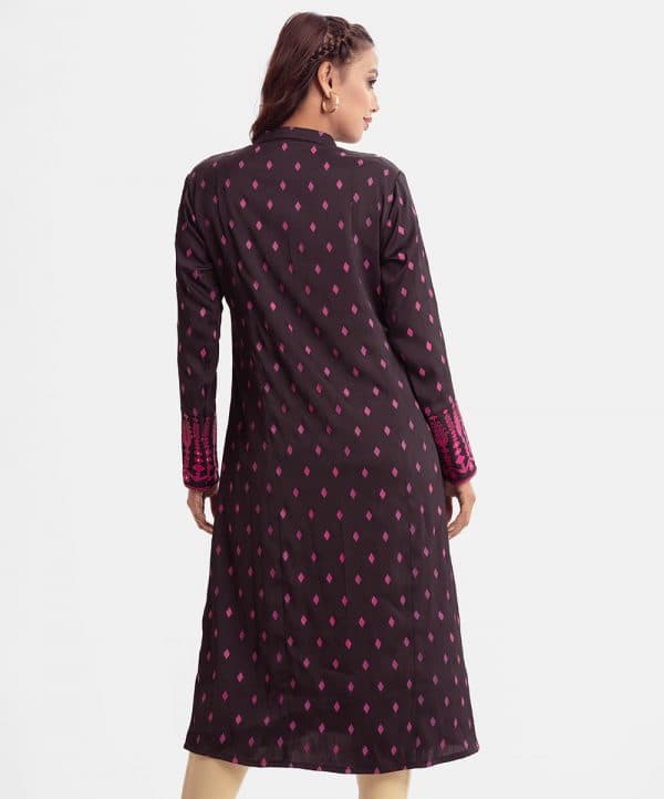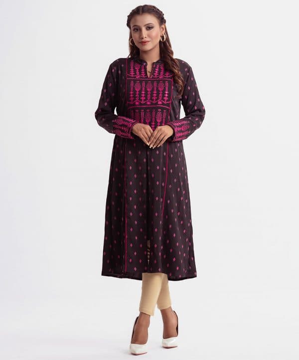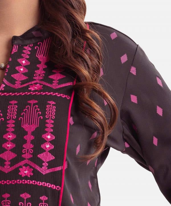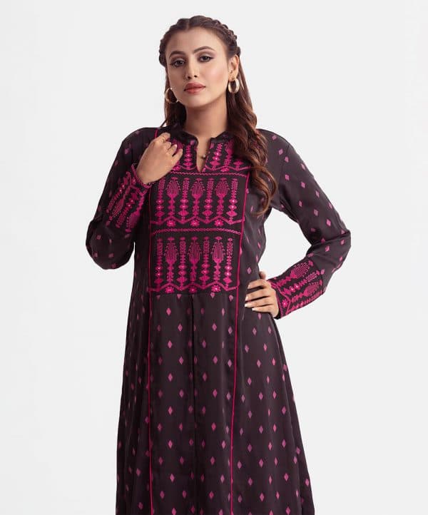 Printed A-line tunic with shrug in joom fabric. Stand collar, long-sleeved. Embroidery at the top front and the crepe is attached internally.