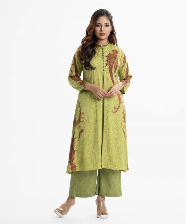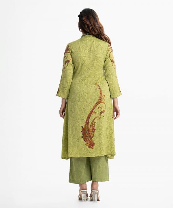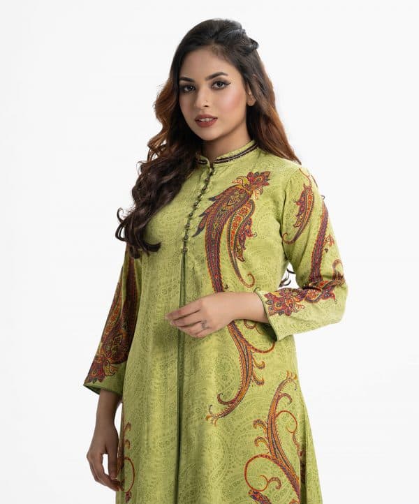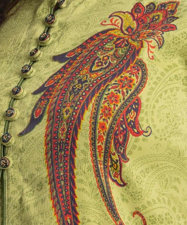 Printed A-line tunic with shrug in joom fabric. Long-sleeved, karchupi at the stand collar and button. Joom fabric the attached tunic.