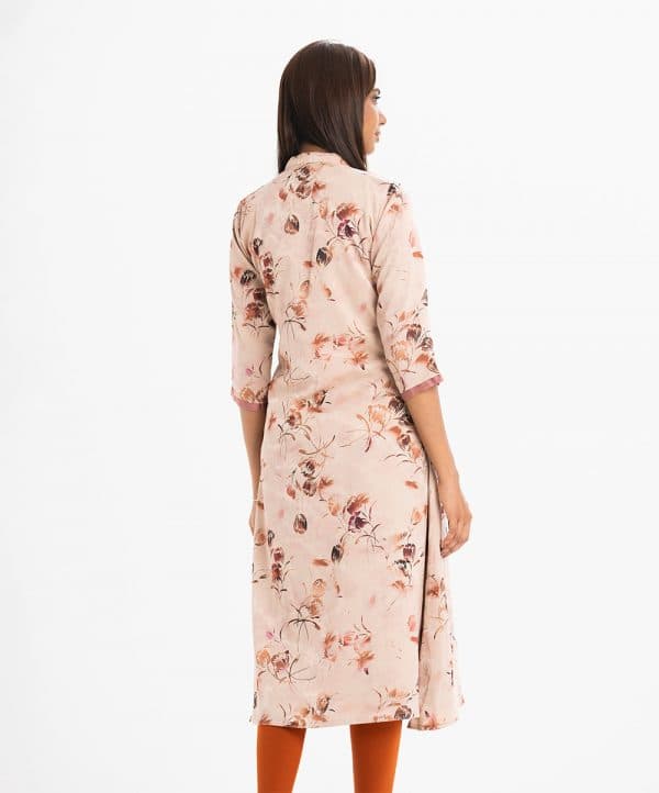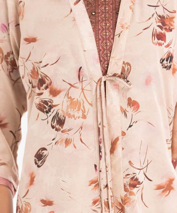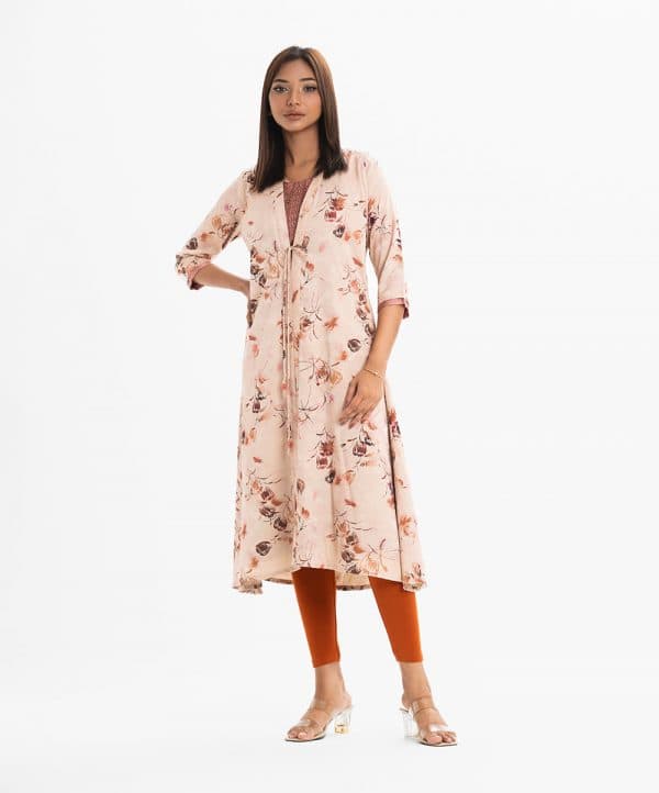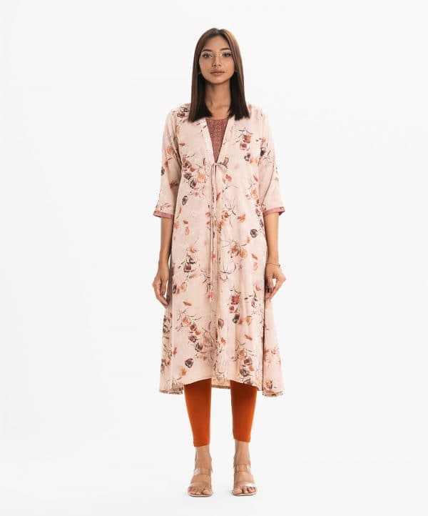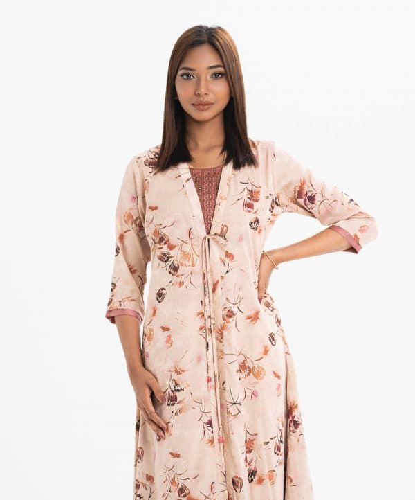 Women’s A-line tunic with open front shrug in jacquard fabric. The shrug features three-quarter sleeves with tassel detailing, paired with an attached crepe tunic adorned with karchupi at front.