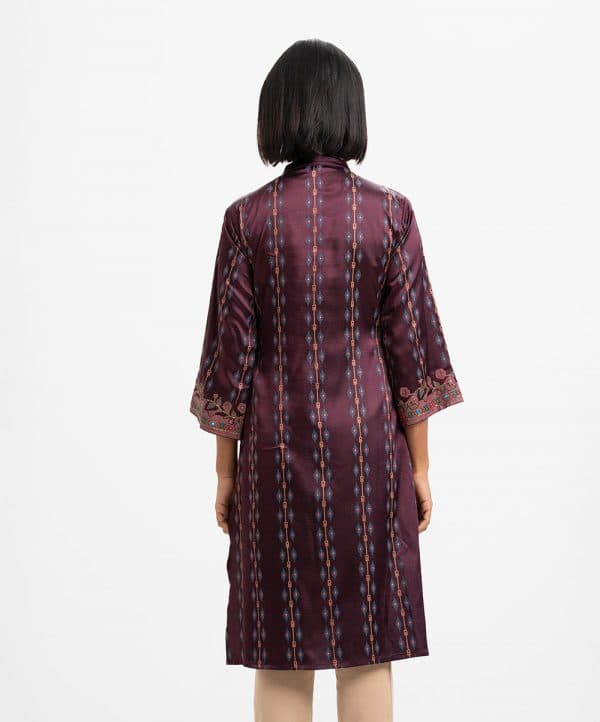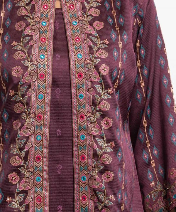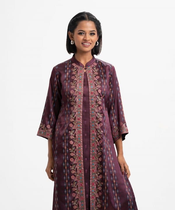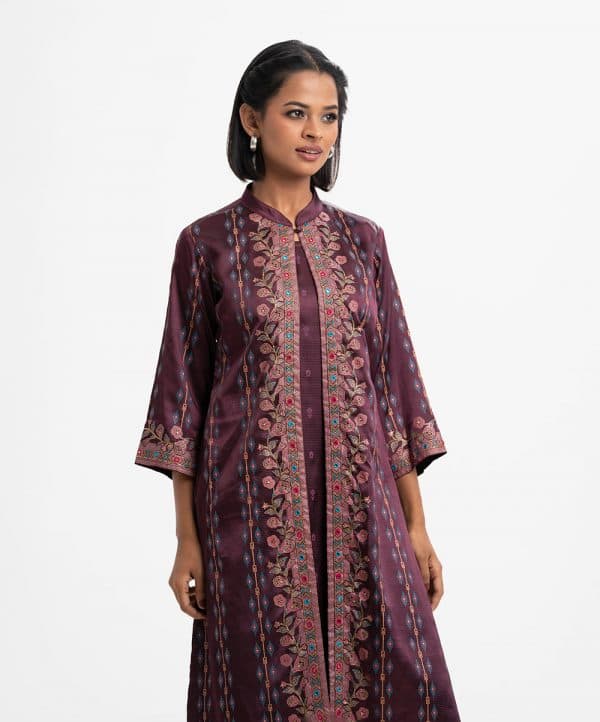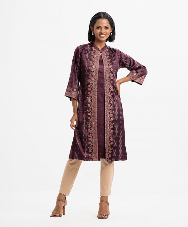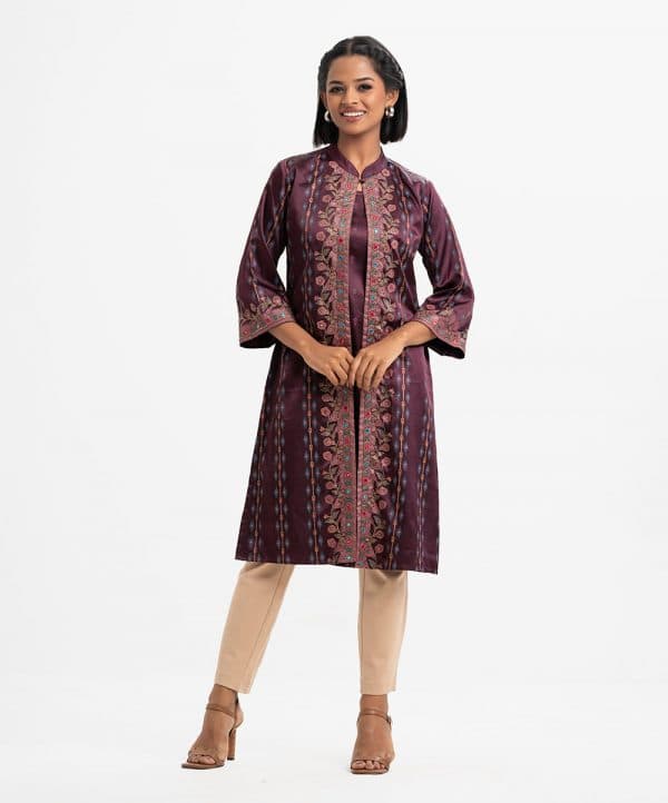 Front single button opening, three-quarter sleeves, floral printed crepe shrug with attached tunic. Karchupi at the front and sleeves.