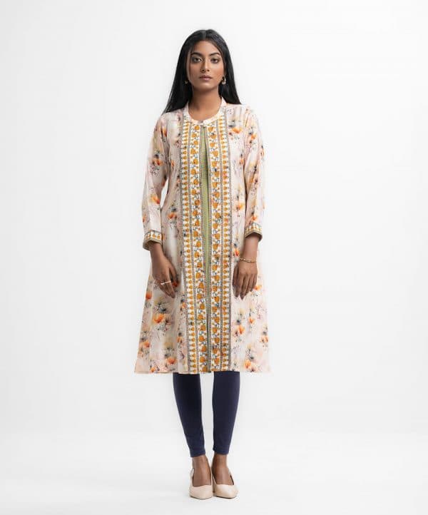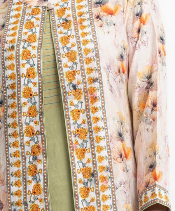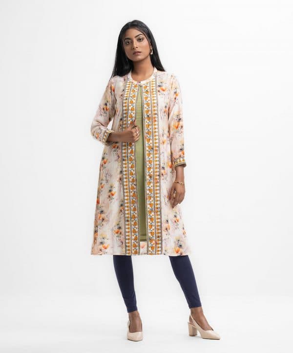 Front single button opening, three-quarter sleeved, floral printed blended cotton shrug with attached tunic. Karchupi at the front.