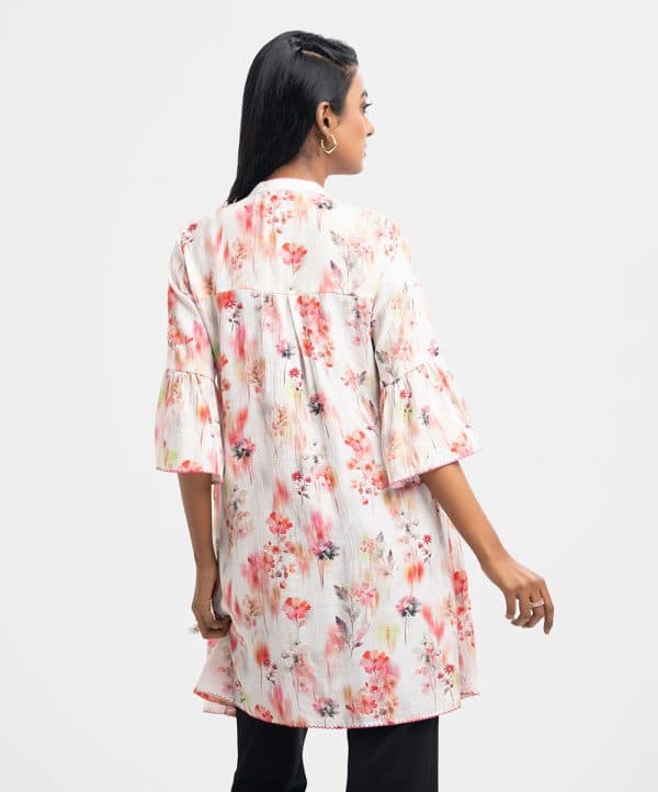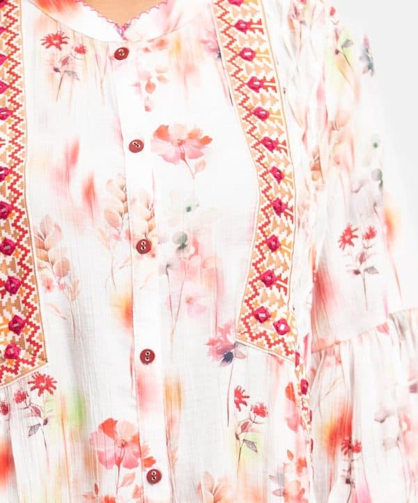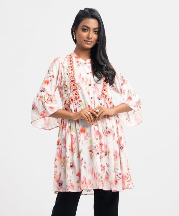 Embroidered woven top in cotton-blended fabric. Three-quarter bell sleeves, mandarin collar, diamond pin tuck details.