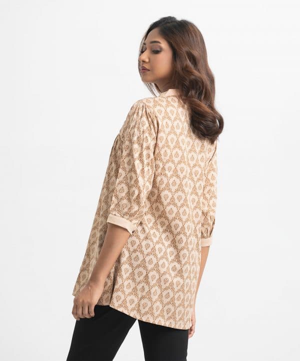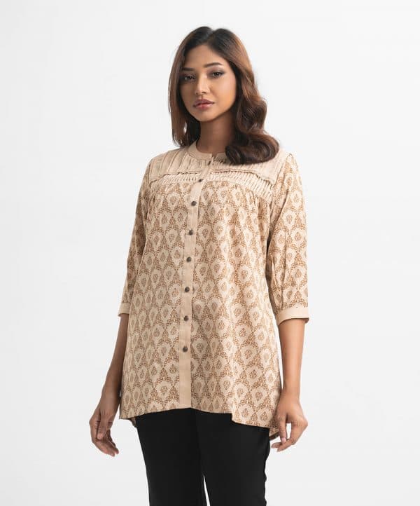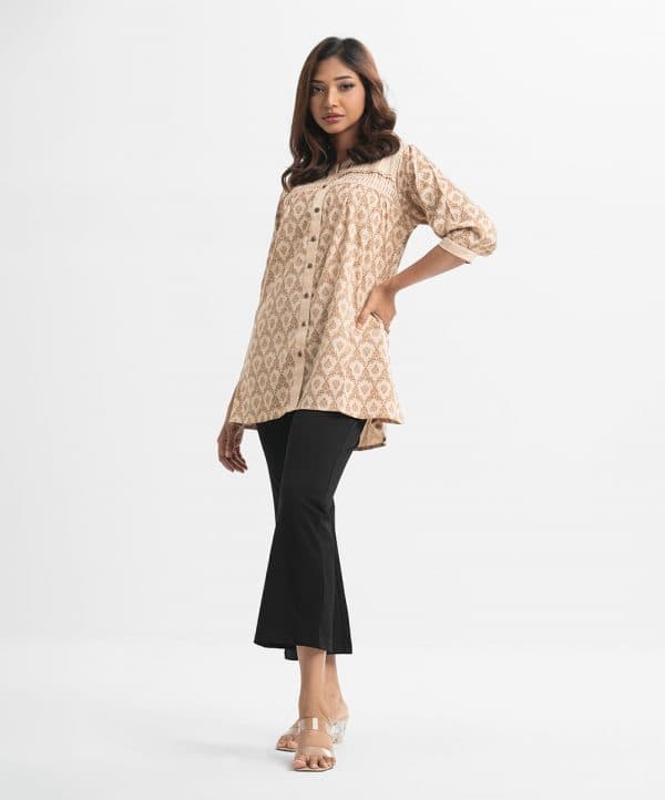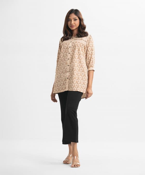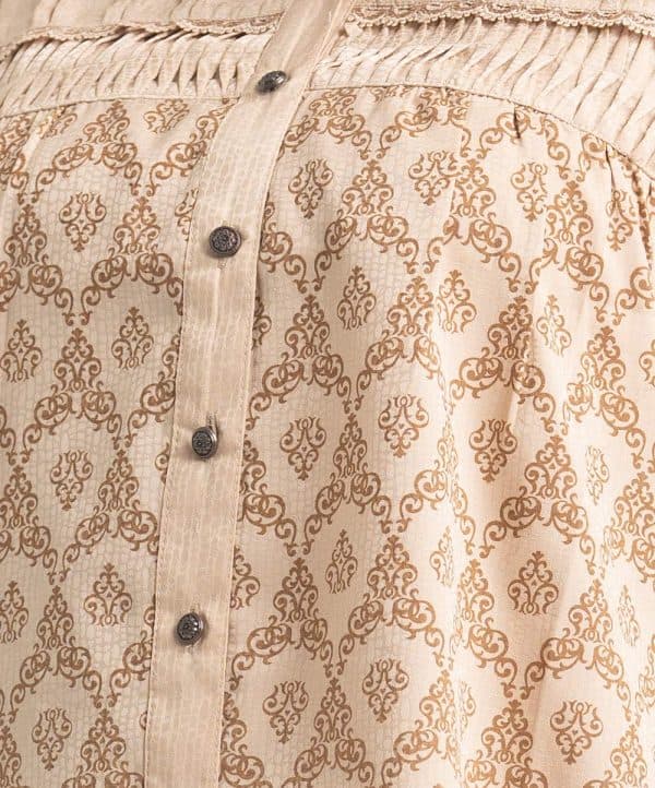 Women’s printed tent-style top in textured georgette fabric. Stand collar, three-quarter cuff sleeves. Lace attached, pintuck and buttons fastening at front.