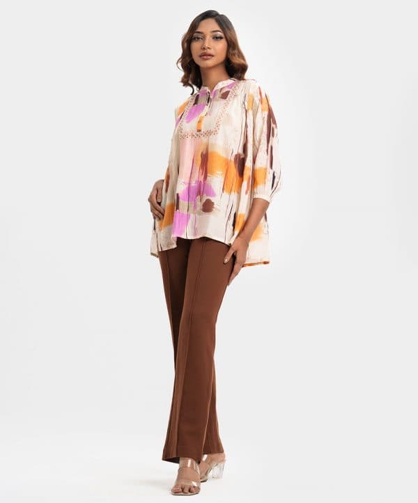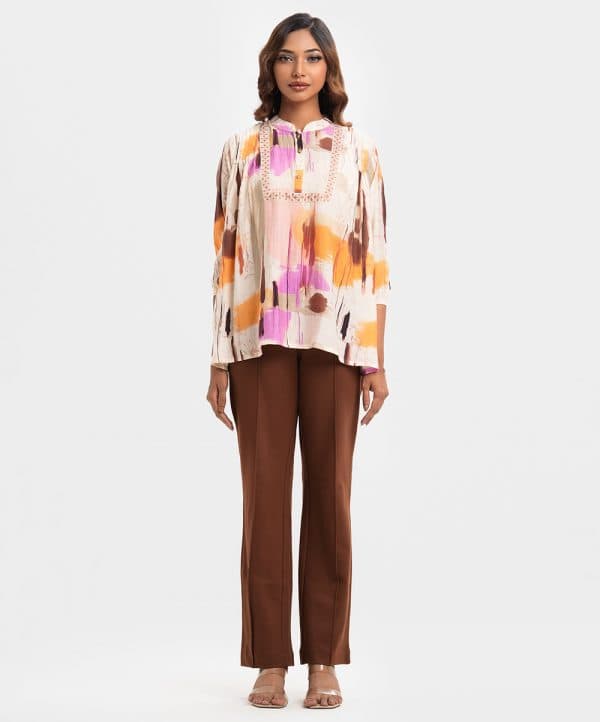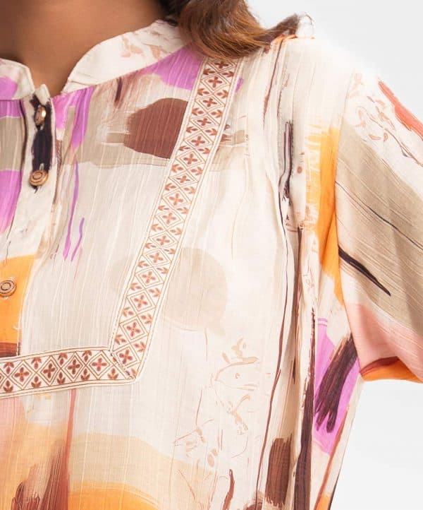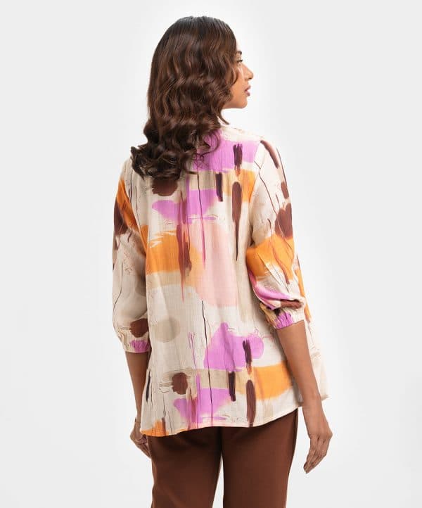 Women’s tent style tops in printed blended cotton fabric. Mandarin collar with buttons placket, three-quarter sleeves. Pintuck and patch at front.