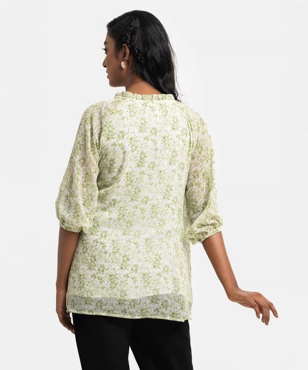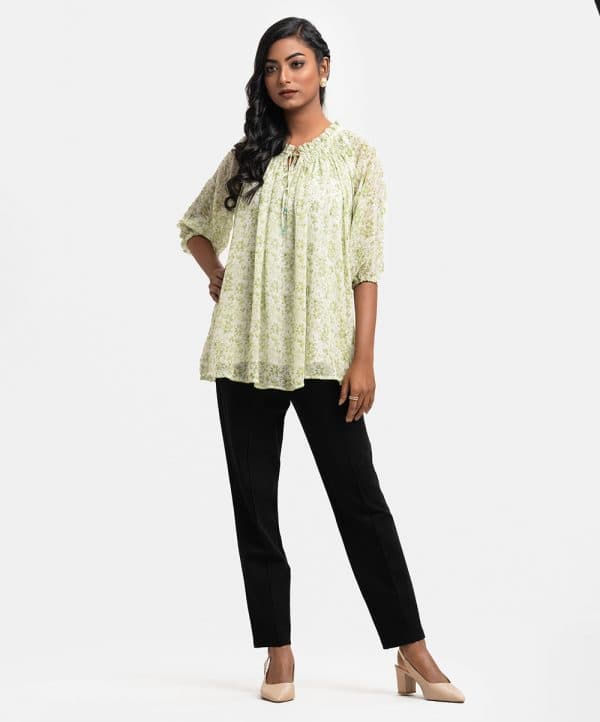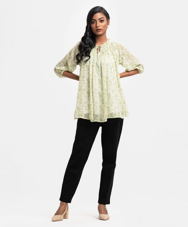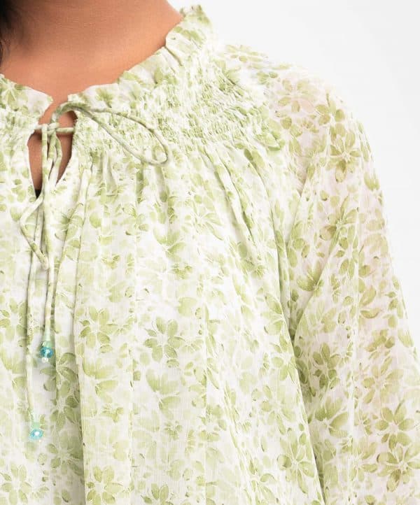 Women’s A-line tops in printed georgette fabric with viscose lining. Frill neck with smocked design and tassel tie, bishop sleeves.