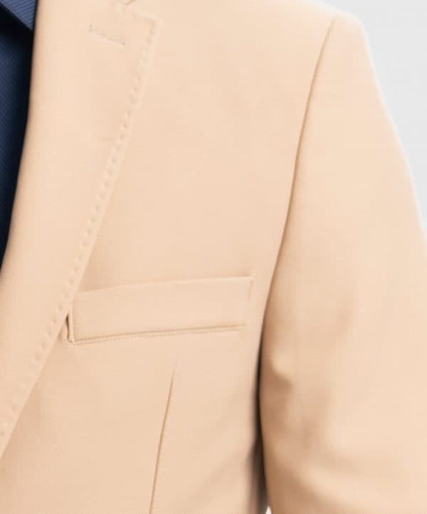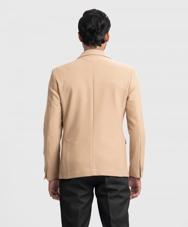 Slim-fit, single-breasted premium knit blazer in soft, poly woven fabric with a stretchable silhouette. Notched lapels with a decorative buttonhole, two buttons at front, and decorative buttons at cuffs. Welt chest pocket, front pockets with flap with inner pockets. Lined.