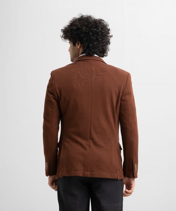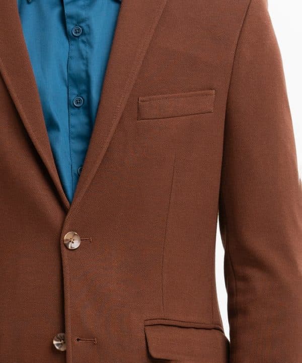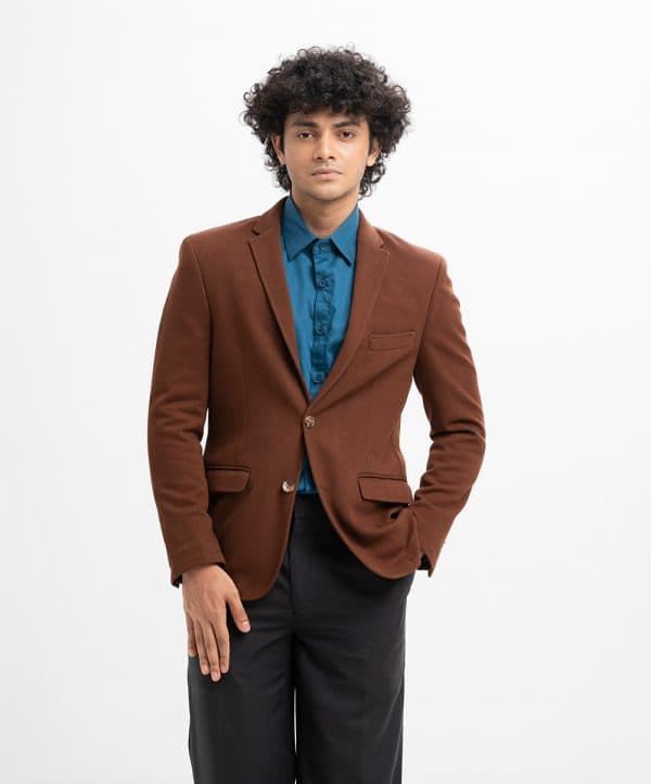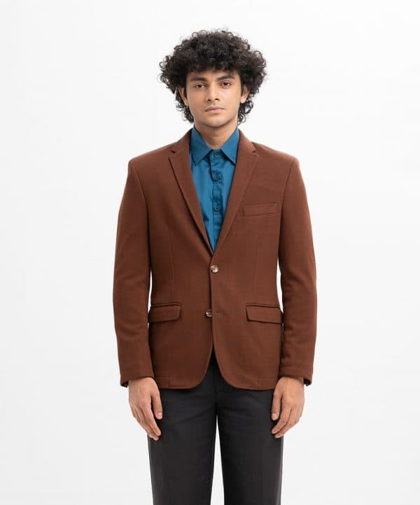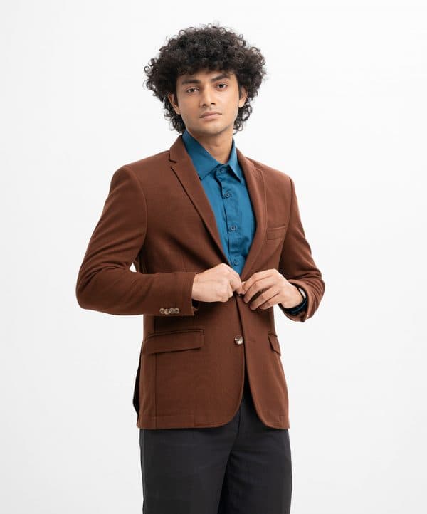 Slim-fit, single-breasted premium knit blazer in soft, woven fabric with a stretchable silhouette. Notched lapels with a decorative buttonhole, two buttons at front, and decorative buttons at cuffs. Welt chest pocket, front pockets with flap with inner pockets. Lined.