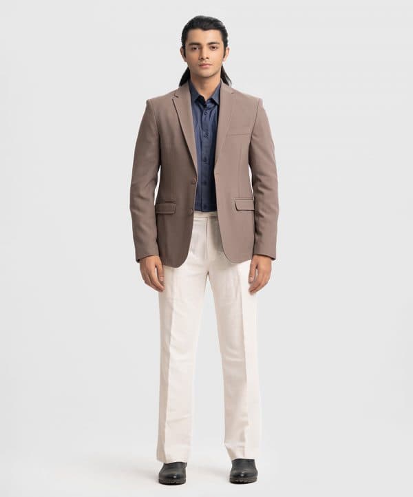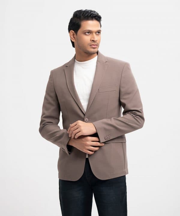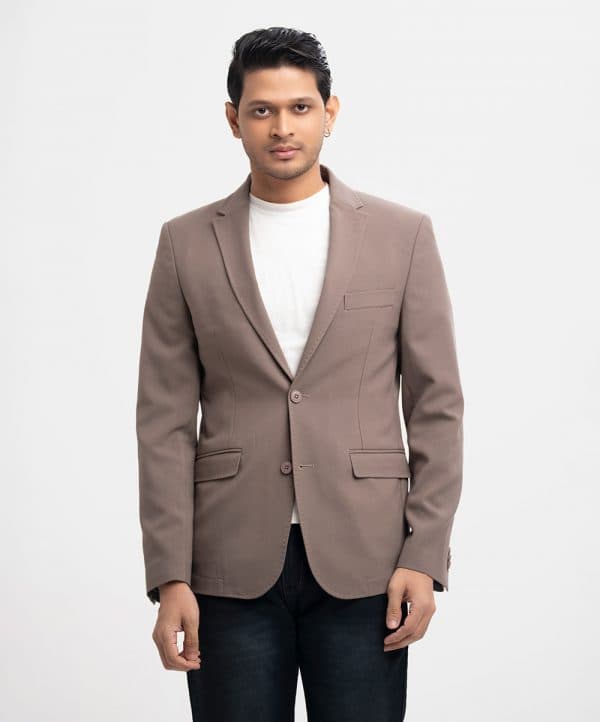 Single-breasted business casual blazer in soft, poly woven fabric with a stretchable silhouette. Notched lapels with a decorative buttonhole, two buttons at front, and decorative buttons at cuffs. Welt chest pocket, front pockets with flap with inner pockets. Lined.