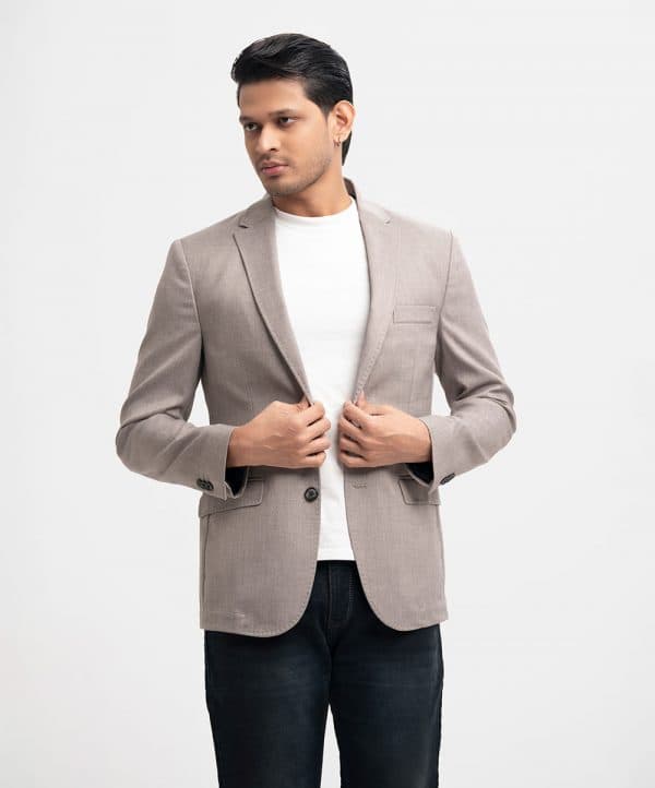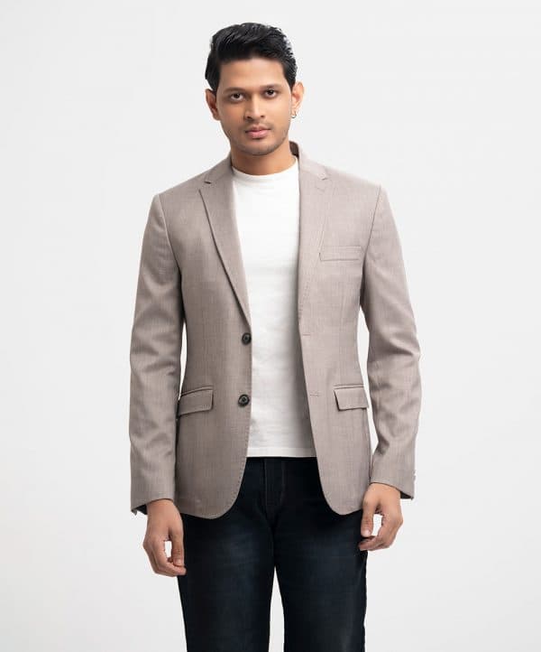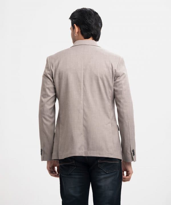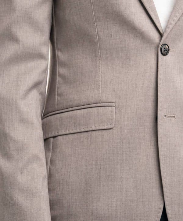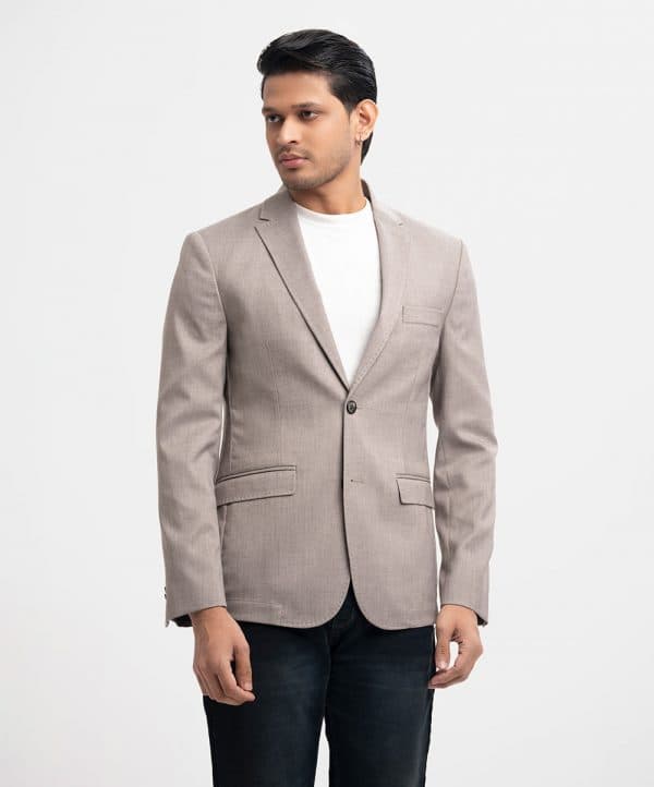 Single-breasted business casual blazer in soft, poly woven fabric with a stretchable silhouette. Notched lapels with a decorative buttonhole, two buttons at front, and decorative buttons at cuffs. Welt chest pocket, front pockets with flap with inner pockets. Lined.
