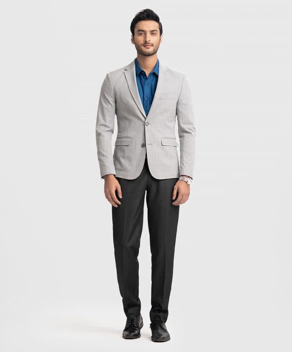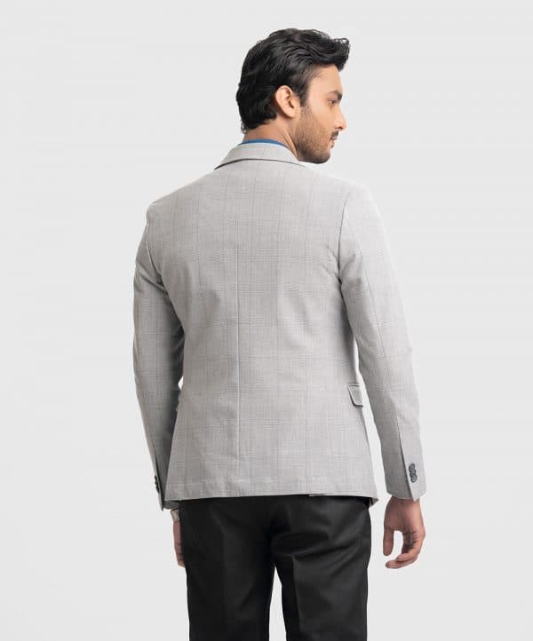 Single-breasted business casual blazer in soft check fabric with a stretchable silhouette. Notched lapels with a decorative buttonhole, two buttons at front, and decorative buttons at cuffs. Welt chest pocket, front pockets with flap with inner pockets. Lined.