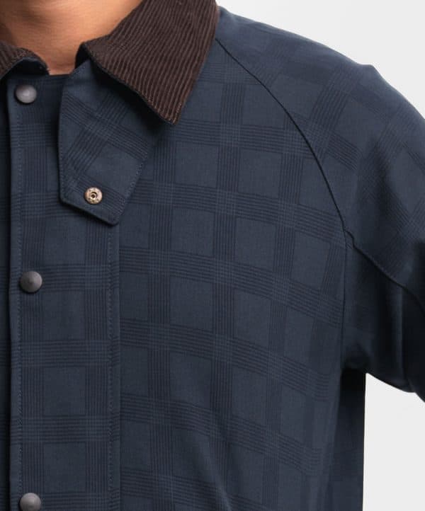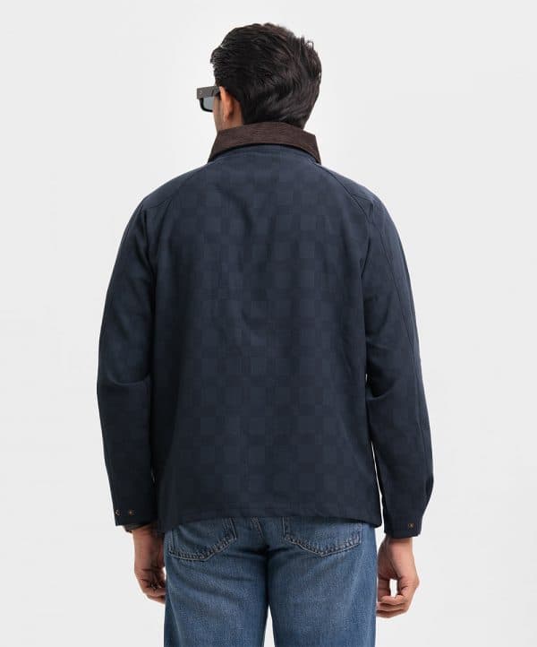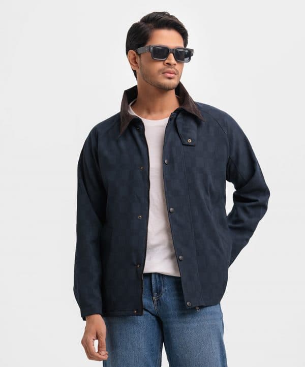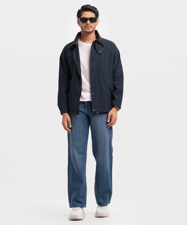 Men’s biker jacket in stretchable blended fabric. Classic collar in corduroy, zipper at front with wind flap and snap fasteners, long sleeves. Diagonal welt side pockets.