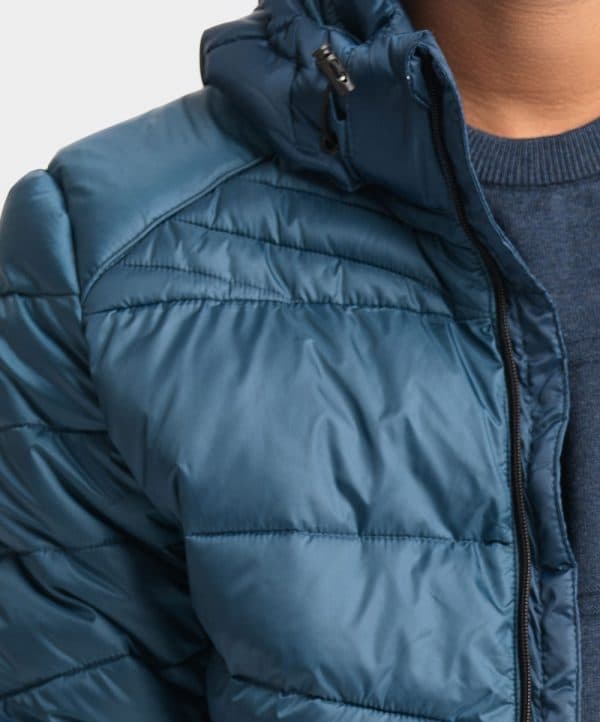 Men’s lightweight puffer jacket in quilted fabric. Stand-up collar with drawstrings hoodie, zipper at front, side pockets with zipper and open inner pockets. Lined.