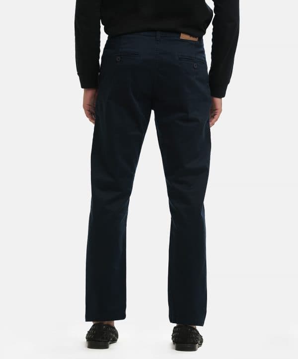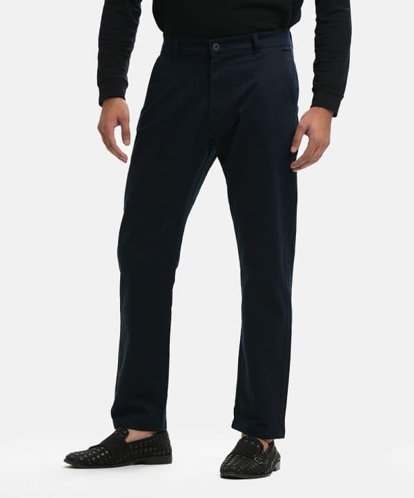 Men’s slim-fit chinos in blended cotton Spandex fabric. Front zip fly with button, diagonal side pockets, and welt back pockets.