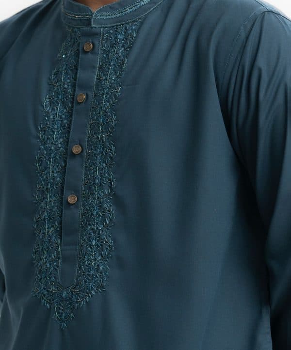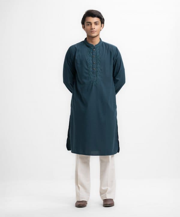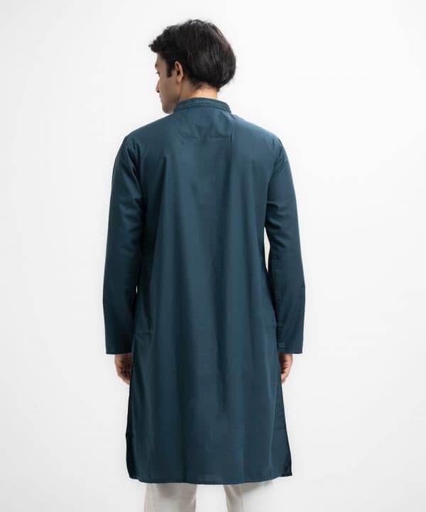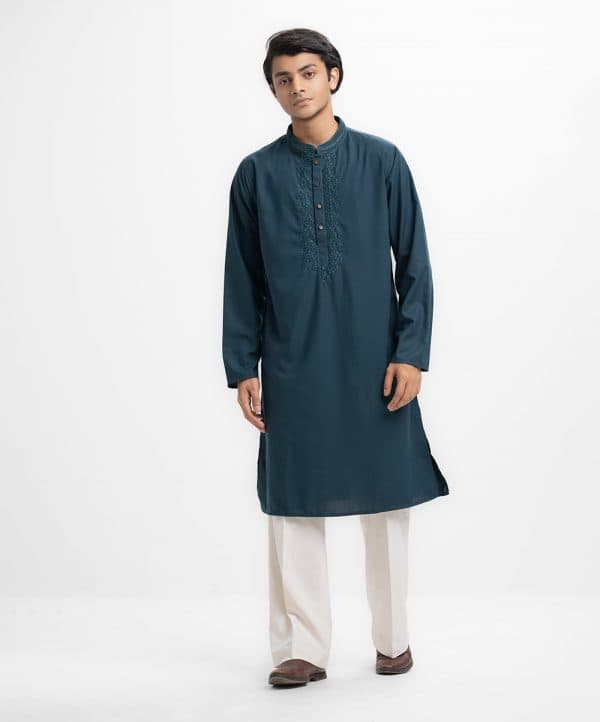 Men’s premium panjabi in blended fabric. Karchupi at mandarin collar and metal buttons placket side. Full sleeves & inseam pockets.