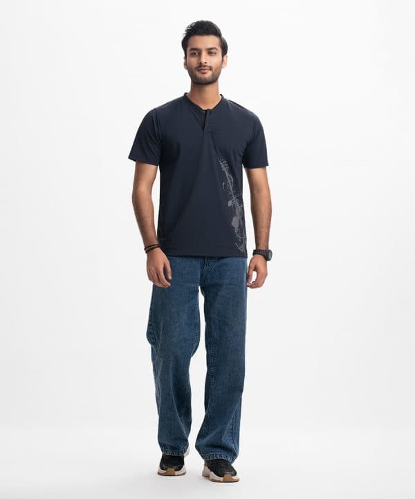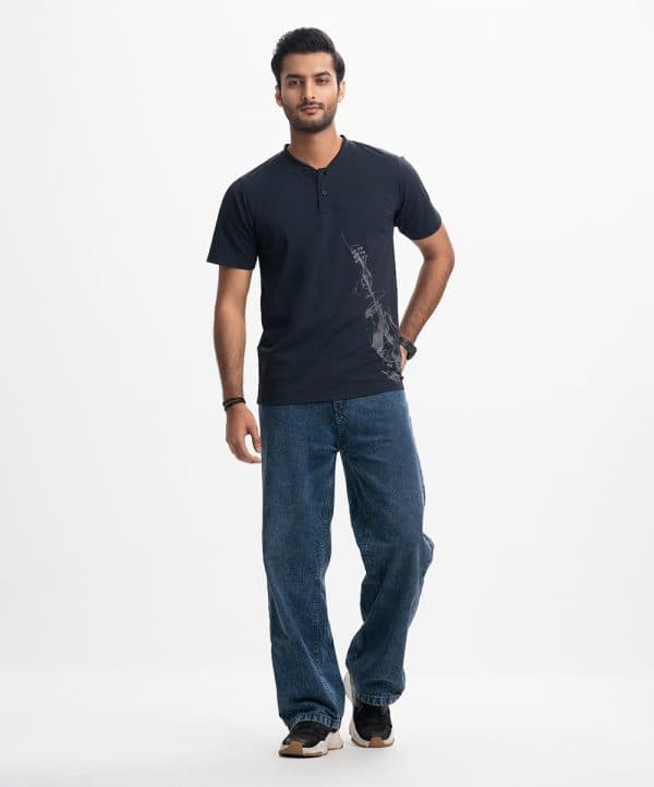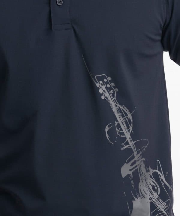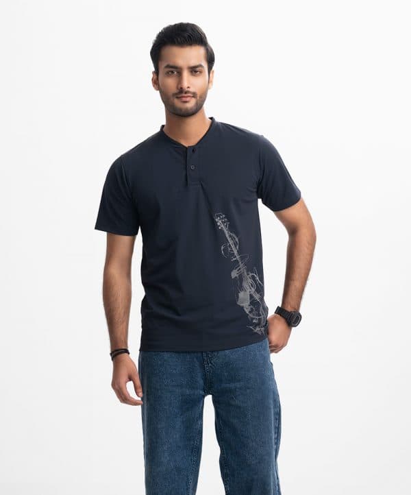 Men’s henley T-shirt in Interlock knit fabric. Rounded scoop neckline with front button fastening and short sleeves. Guitar print detail at front.
