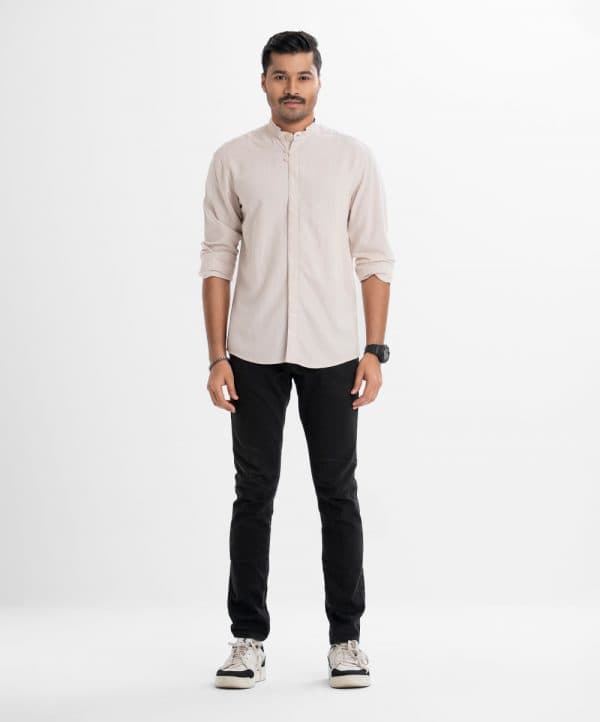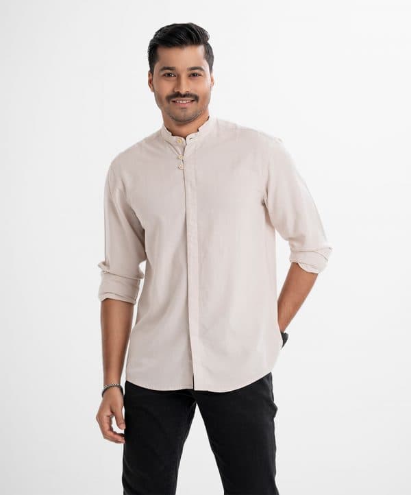 Men’s solid color casual shirt in cotton fabric. Banded collar, full sleeves. Two show buttons at front and hidden buttons fastening.
