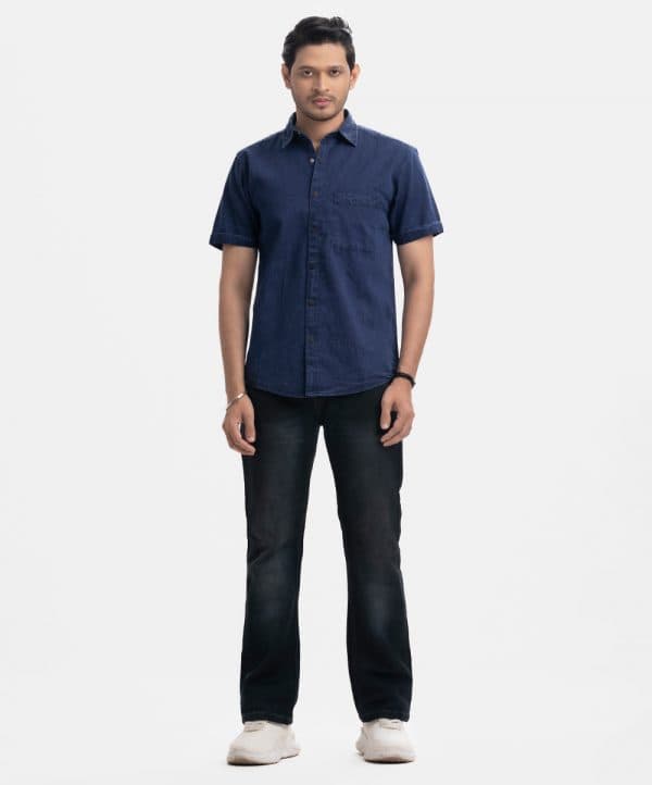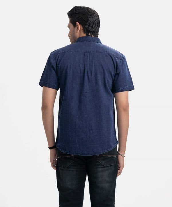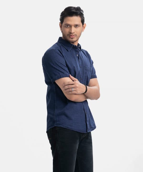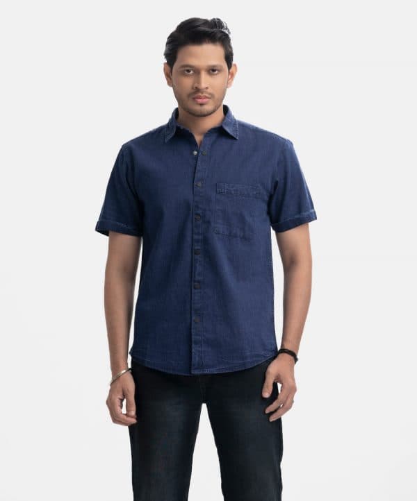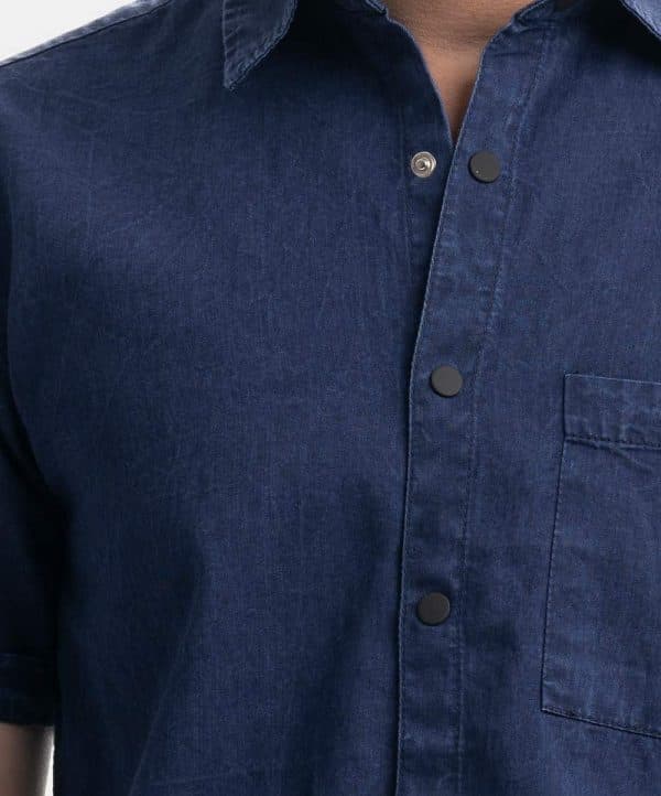 Short-sleeved casual shirt in soft denim fabric. Classic collar, folded cuffs with snap button opening.