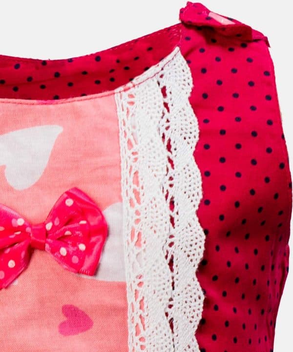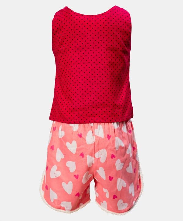 Newborn baby girl’s bottom tops set in cotton fabric. Round neck, sleeveless. Lacework and bow at front of the top and design short pants.
