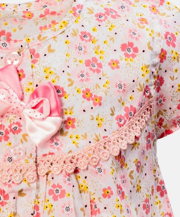 Short sleeve tent-style newborn baby girls frock in cotton fabric. All-over floral printed with lace work at the front and button fastening. Completed with baby pants.