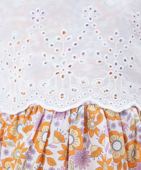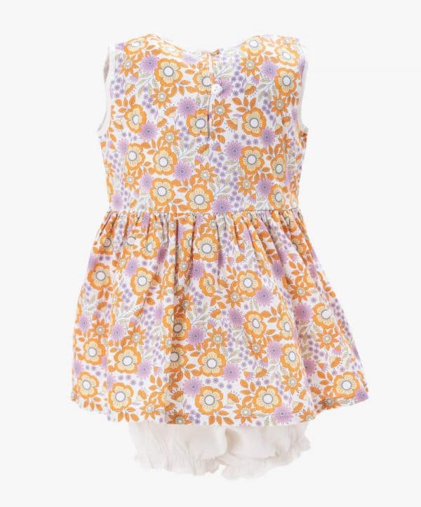 Newborn girls printed frock and pant set in cotton fabric. Sleeveless, round neck and cutwork patched at front. Paired with a baby pant.