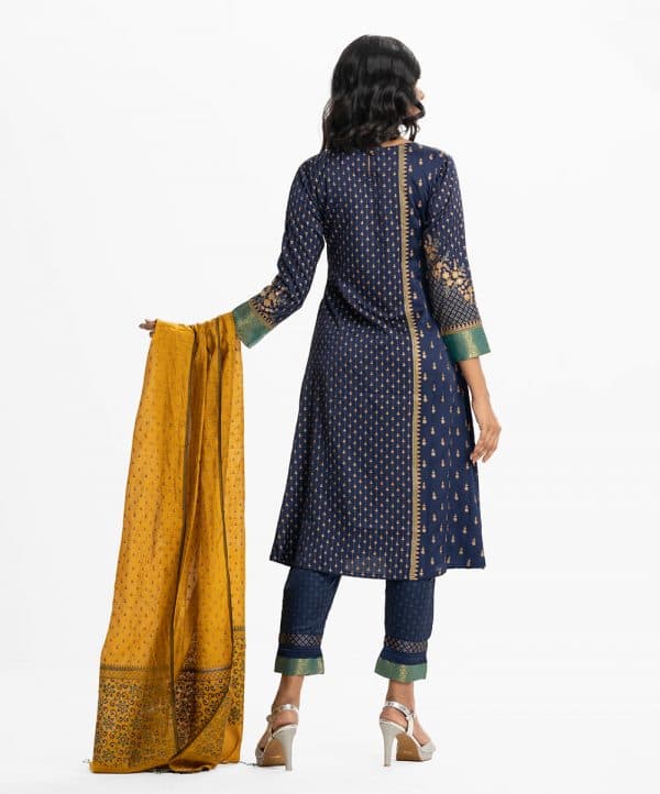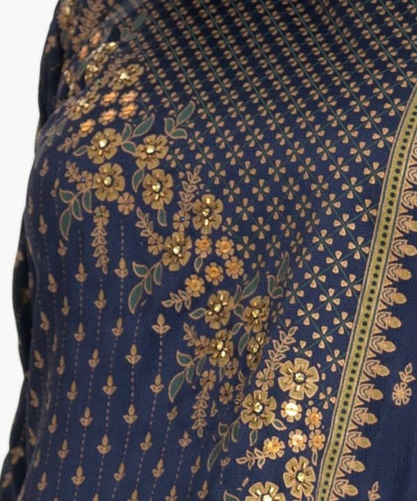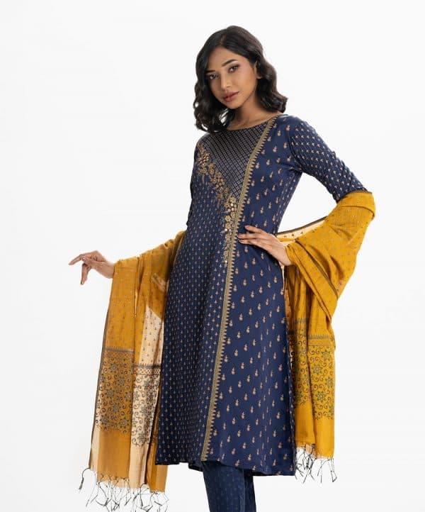Women’s printed salwar kameez in crepe fabric. Boat neck, full sleeves with katan fabric patch at hem and karchupi at front of kameez. Half-silk dupatta with viscose culottes pants.