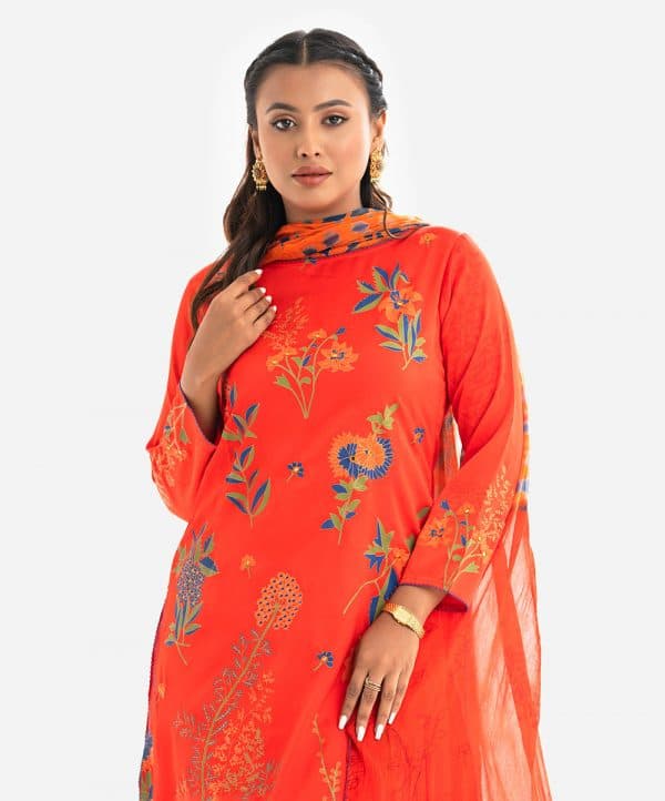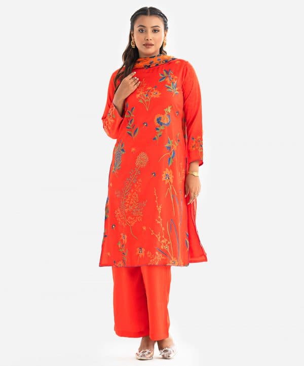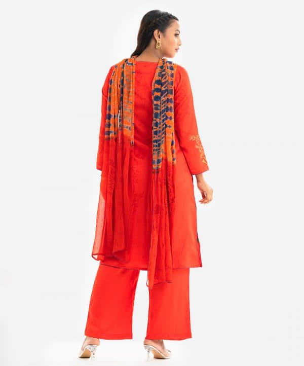 Women’s printed straight salwar kameez in crepe fabric. Boat neck, three-quarter sleeves. Karchupi at the front. Complemented with crepe palazzo and tie-dye chiffon dupatta.