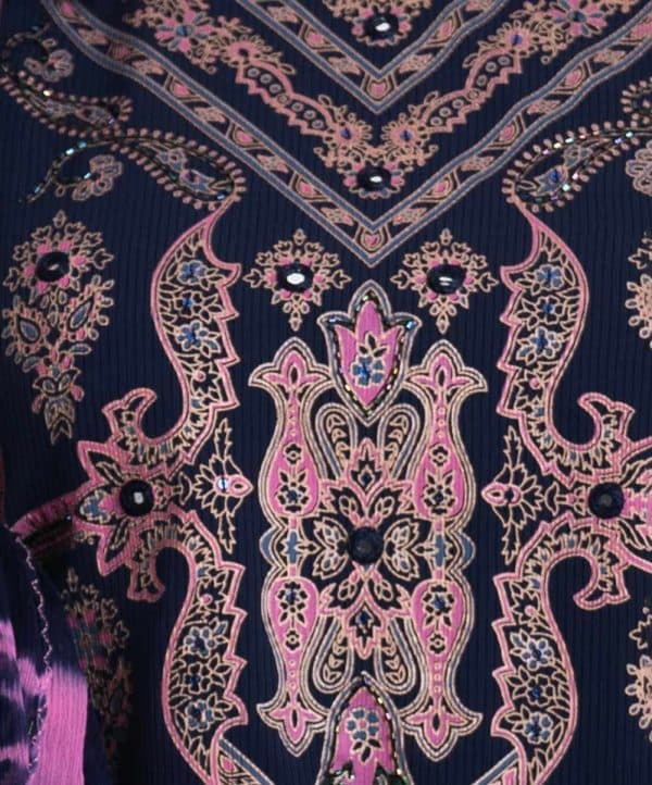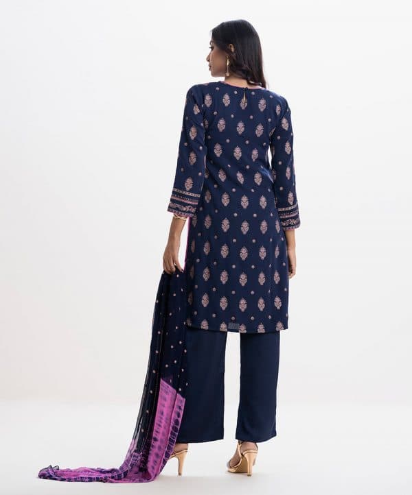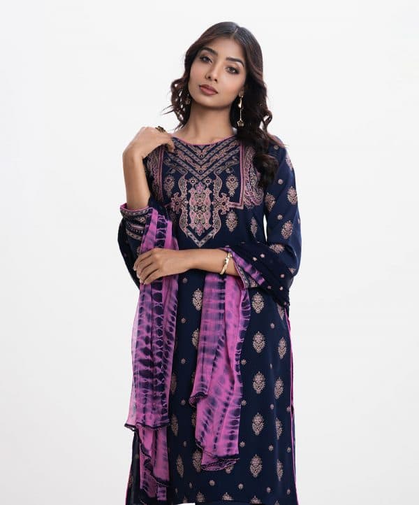 Women’s printed straight salwar kameez in textured georgette fabric. Round neck, karchupi at the front and full sleeves. Crepe silk palazzo and chiffon dopatta.