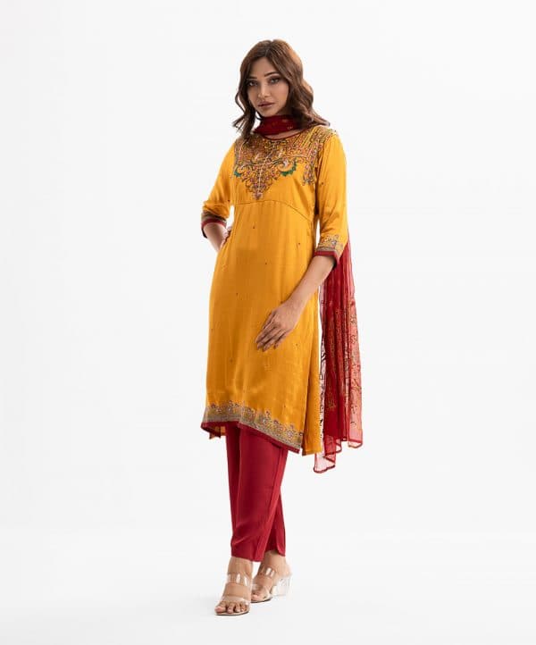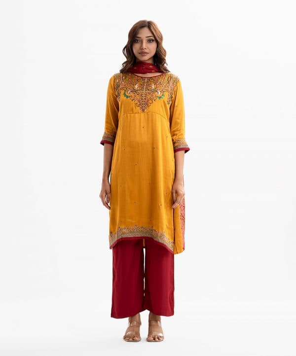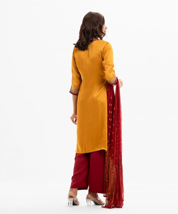 Women’s exclusive straight salwar kameez from Nargisus by le reve in silk & viscose blended fabric. Round neck, three-quarter sleeved and karchupi at the front. Complemented with crepe palazzo pant and muslin dupatta.