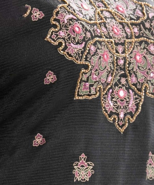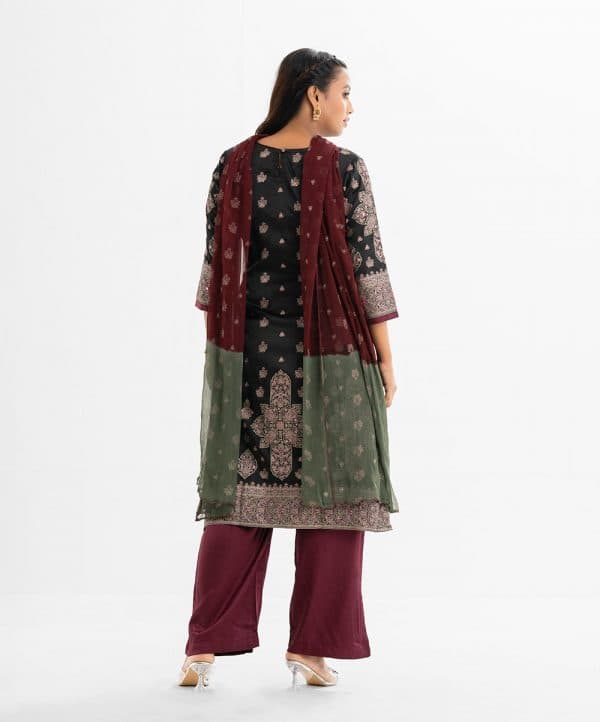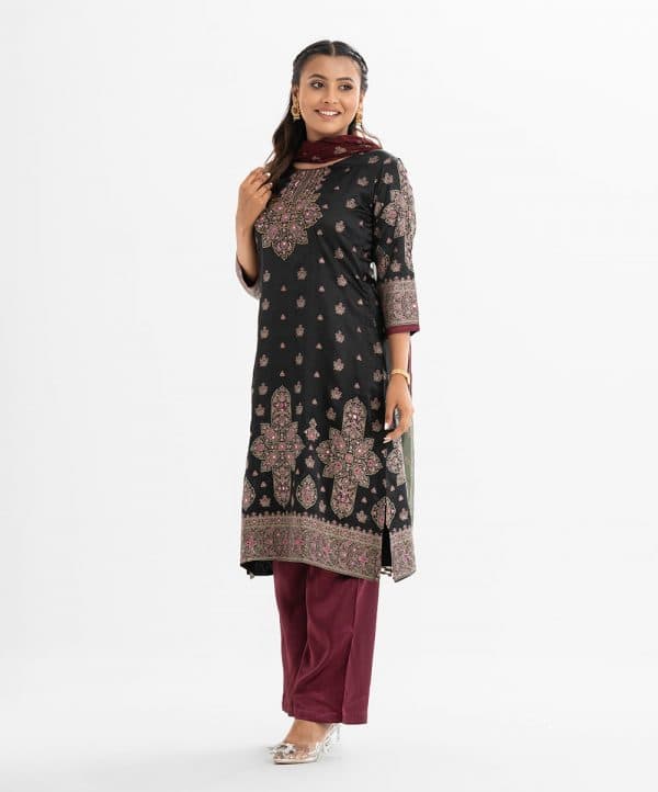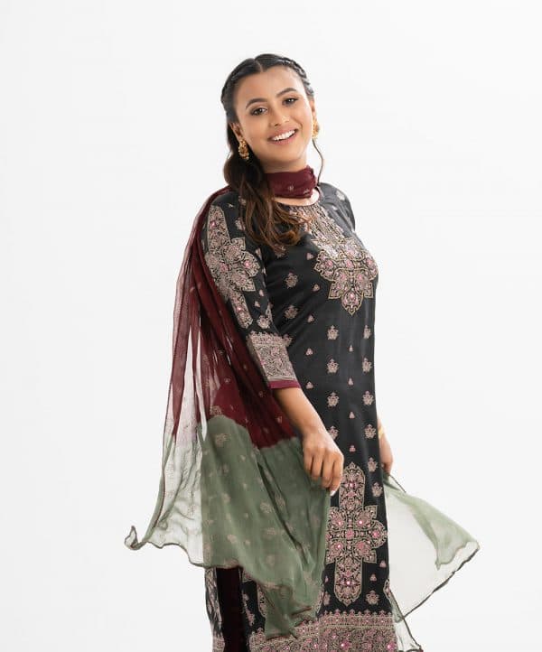 Women printed straight salwar kameez in crepe fabric. Round neck, three-quarter sleeves and karchupi at the front. Complemented with crepe palazzo pant and chiffon dupatta.