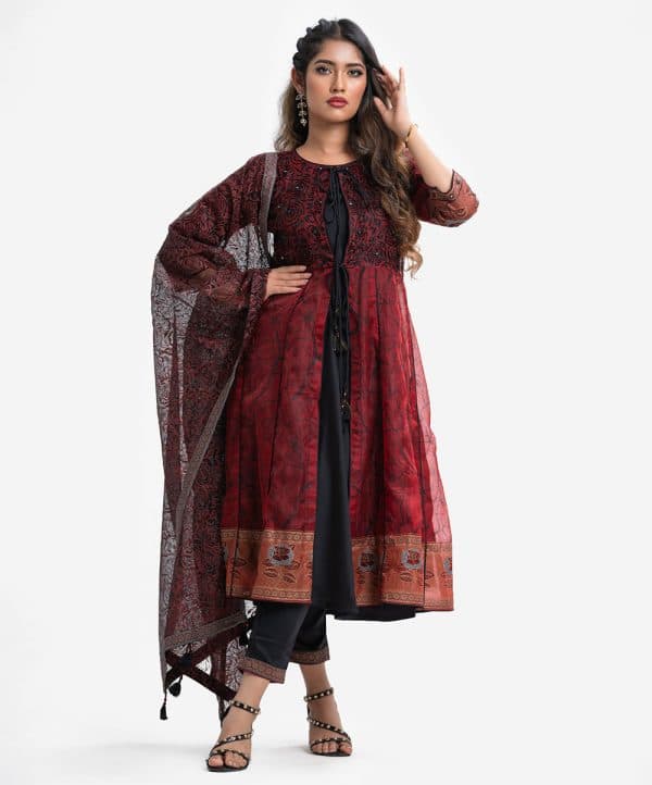 Women’s printed shrug-style salwar kameez from Nargisus by Le Reve. Full sleeved patterned shrug in muslin fabric with crepe inner. Round neck, karchupi detail at the front with tassel and pleats from the waistline. Complemented with a culotte pant and a half-silk dupatta.