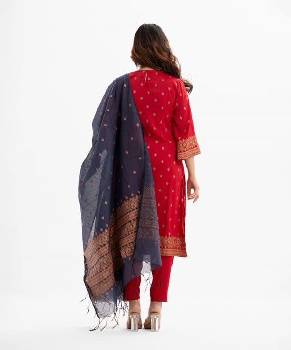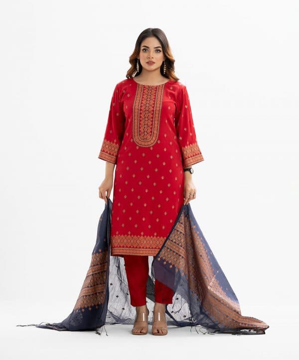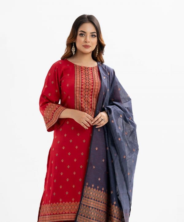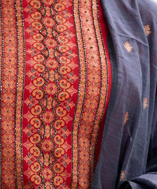 Women’s printed straight salwar kameez in crepe fabric. Round neck, three-quarter sleeves and karchupi at the front. Paired with joom pant and a half-silk dupatta.