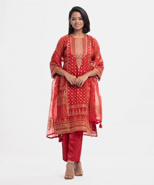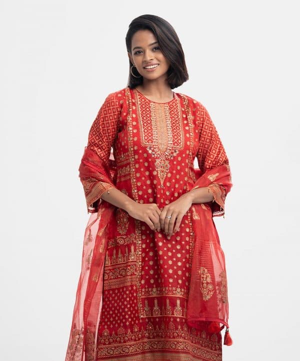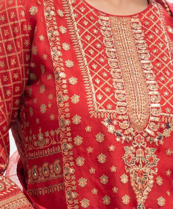 Women’s exclusive layer style salwar kameez in Nargisus by Le Reve. Printed kameez in muslin fabric with a georgette lining. Round neck, three-quarter bell sleeves, beads attached at the sleeves cuff & hemline and heavy karchupi at the front. Muslin dupatta with patch border and solid color leggings.