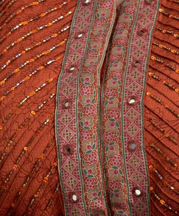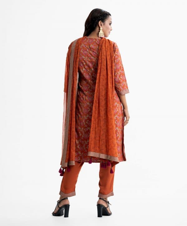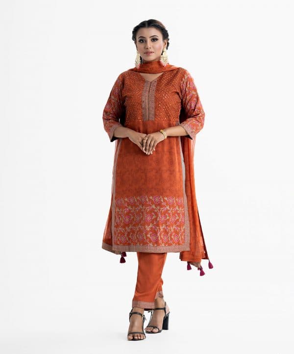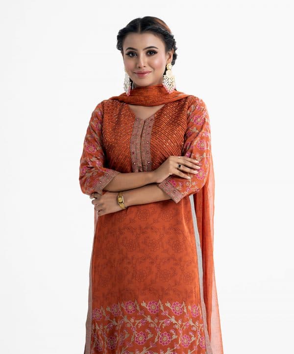 Women’s printed straight salwar kameez in crepe fabric. V-neck, three-quarter sleeved. Patch attachments with karchupi at the front. Completed with crepe culotte pants and chiffon dupatta.
