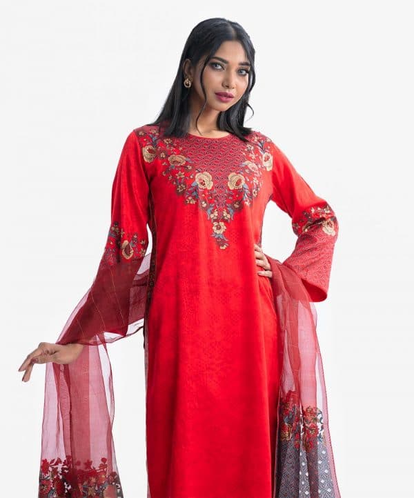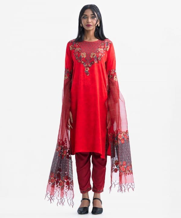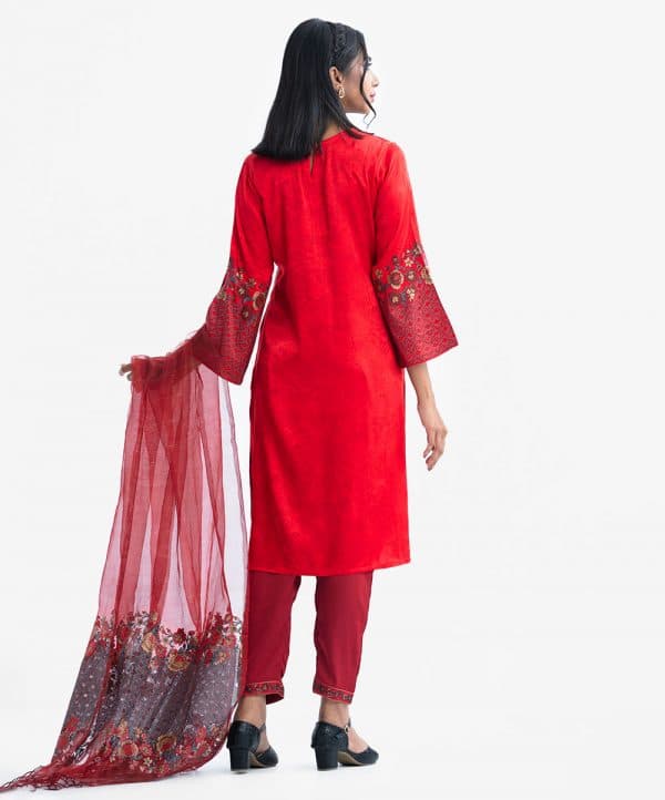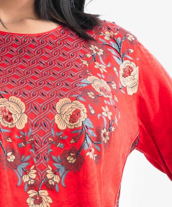Karchupi, print and patch detailed kameez in silk-viscose blended fabric, exclusively from Nargisus by Le Reve. Complemented with crepe palazzo and printed half silk dupatta.