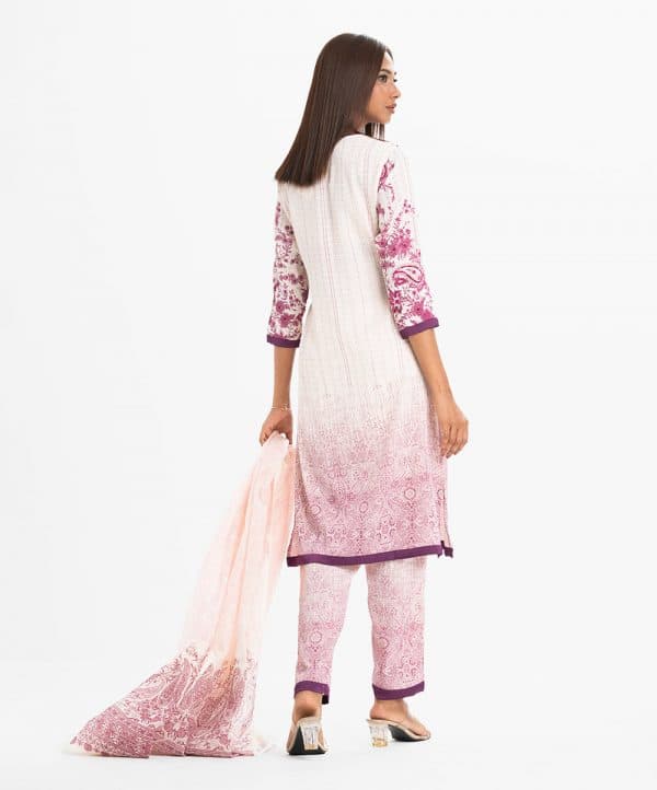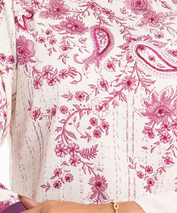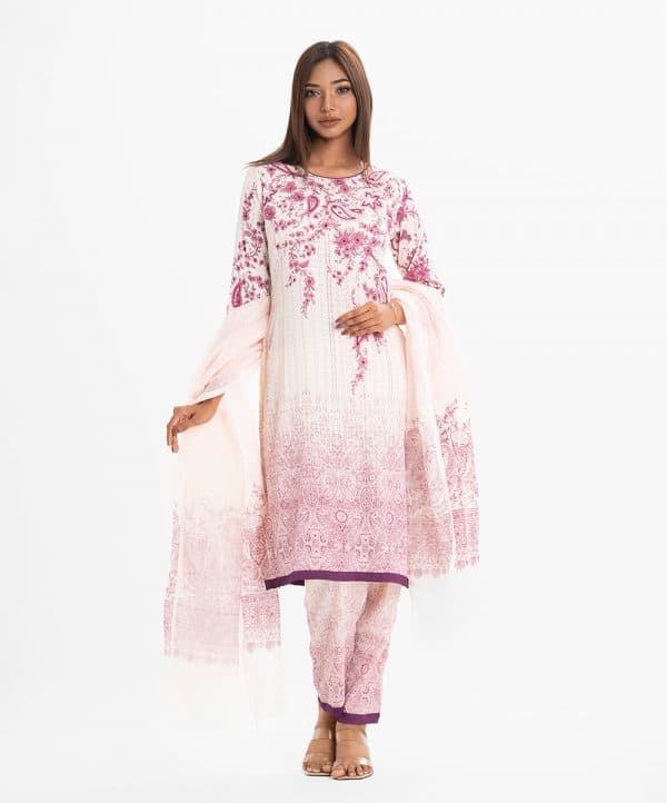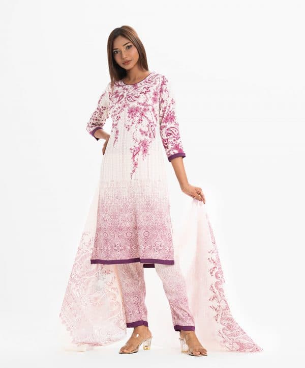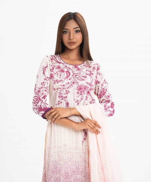 Women’s printed straight salwar kameez in joom fabric. Round neck, three-quarter sleeves and karchupi at the front. Complemented with a joom pant pajama and a half-silk dupatta.