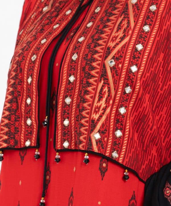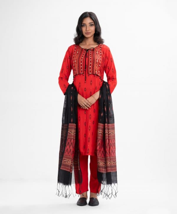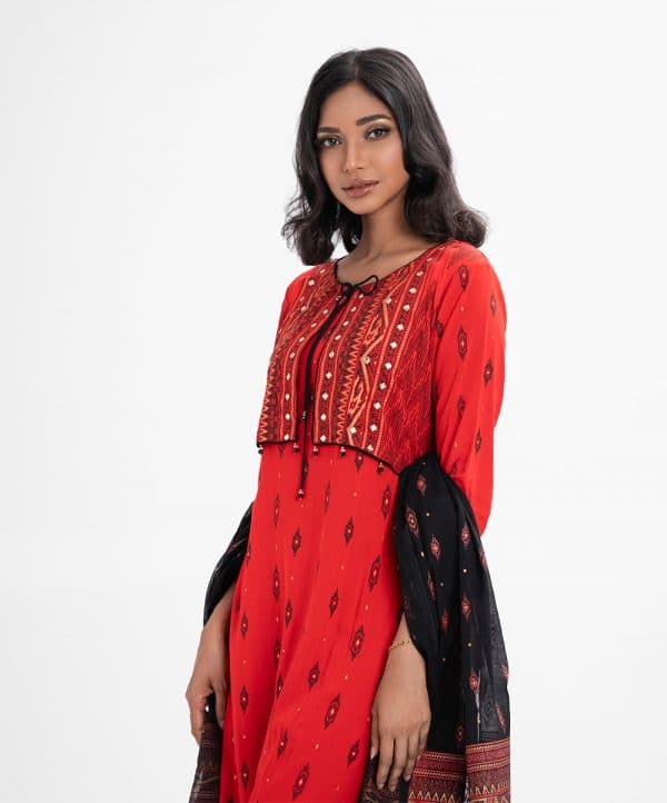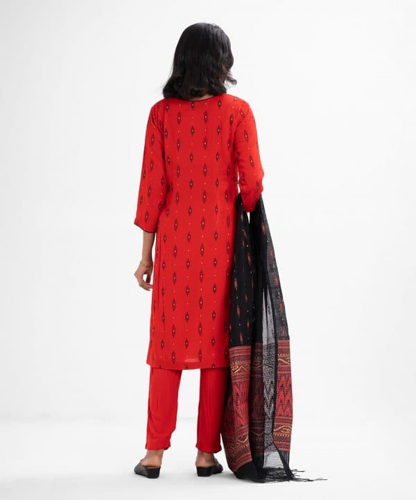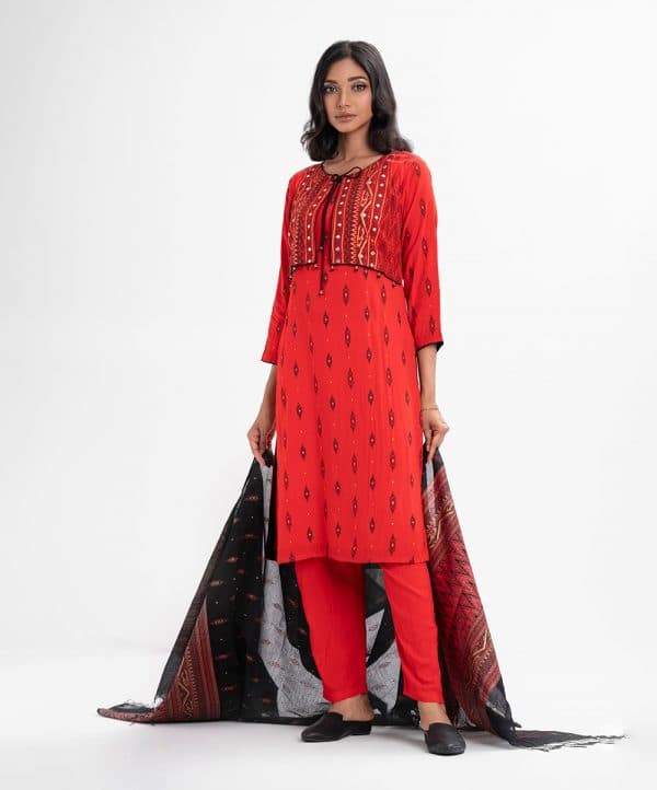 Women printed koti style straight kameez in viscose fabric. Round neck, three-quarter sleeved. Embroidery and bead-work at the front. Complemented with pants and a half-silk dupatta.