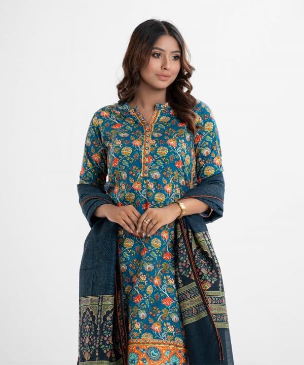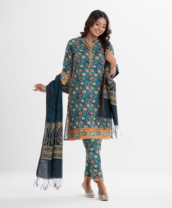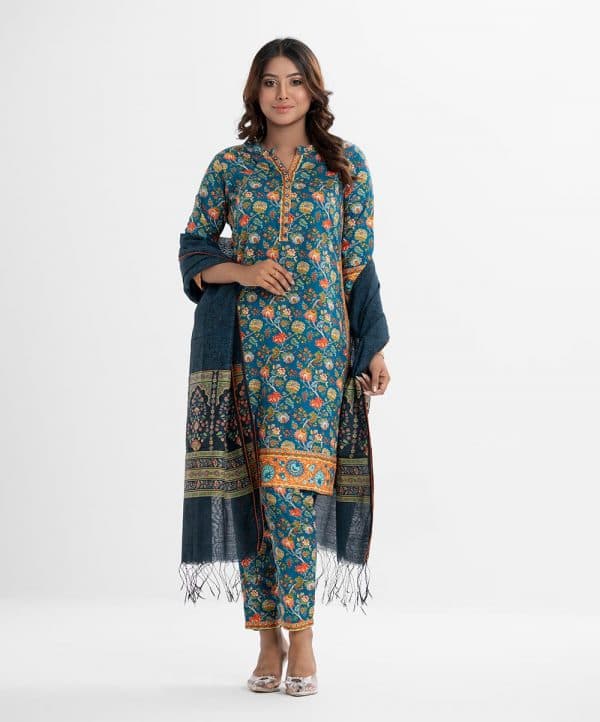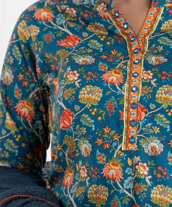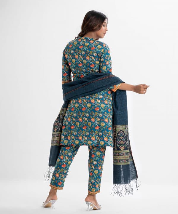 Women printed straight salwar kameez in cotton fabric. Round neck with V cut, three-quarter sleeved. Karchupi at the front and hemline and attached patch. Complemented with cotton pant pajama and half silk dupatta.