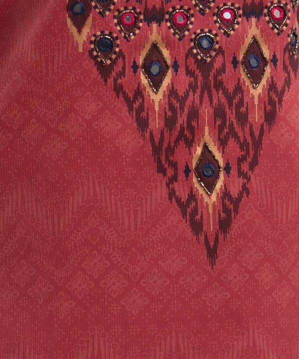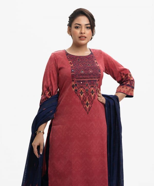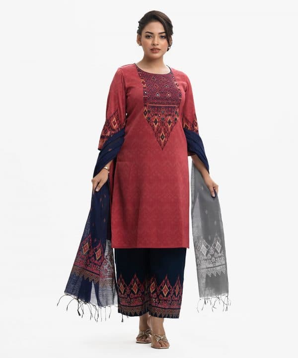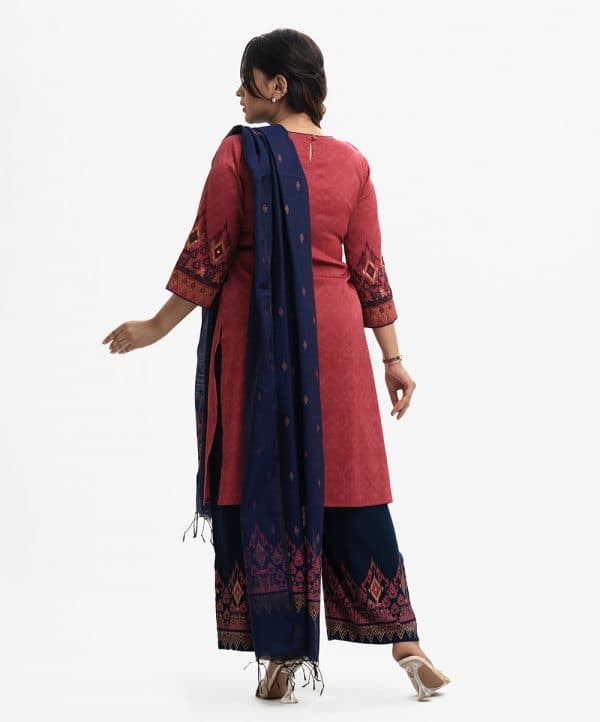 Round neck kameez with three-quarter sleeves and karchupi at the front. Complemented with a viscose palazzo pants and half-silk dupatta.