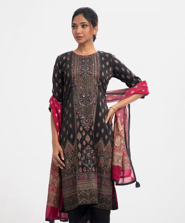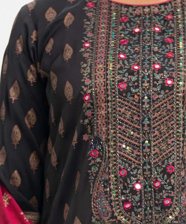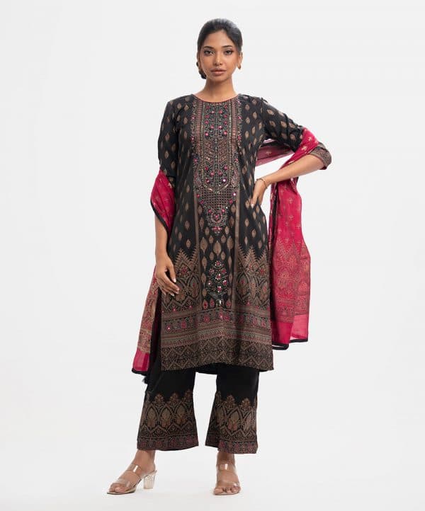 Women’s ethnic printed salwar kameez in joom fabric. Round neck, three-quarter sleeves and heavy karchupi details at front of kameez. Half-silk dupatta with palazzo pants.
