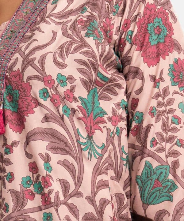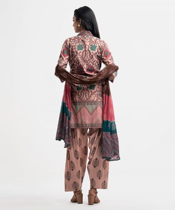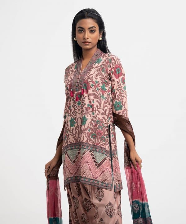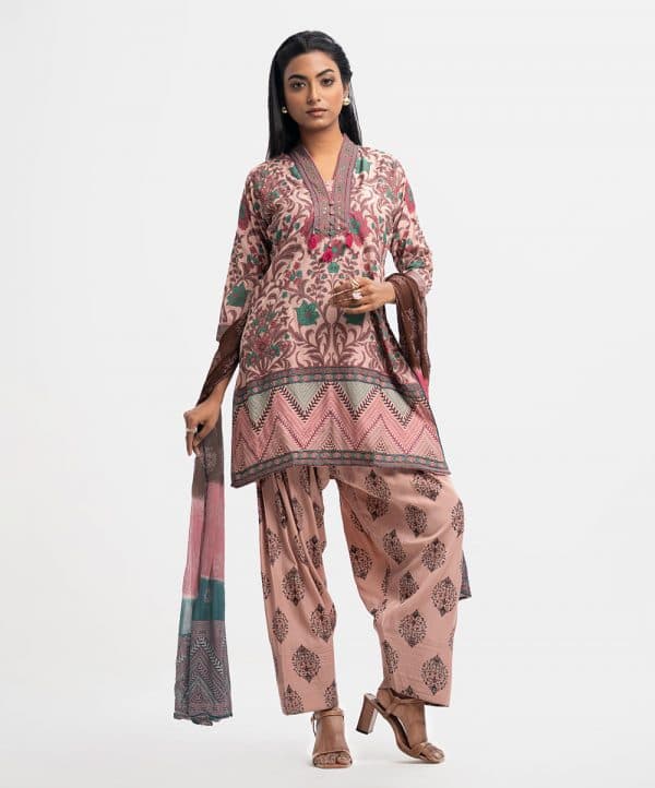 All over printed Salwar Kameez in blended cotton fabric. V-neck, three-quarter sleeves and karchupi at the front of kameez. Chiffon dupatta with wide hem classic pajama.