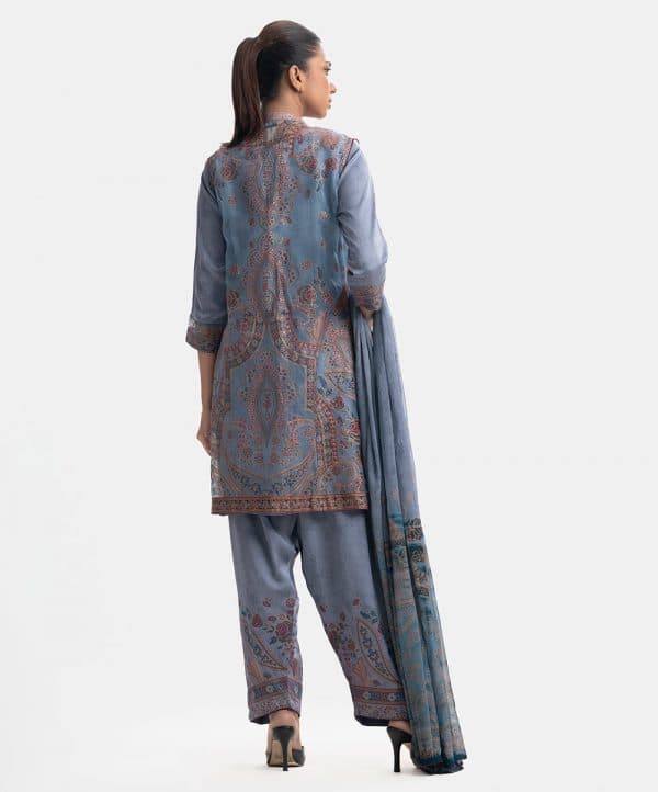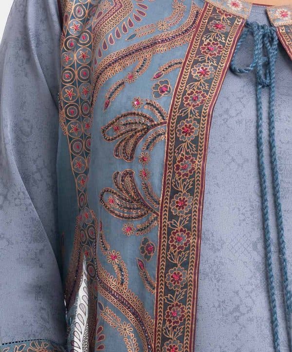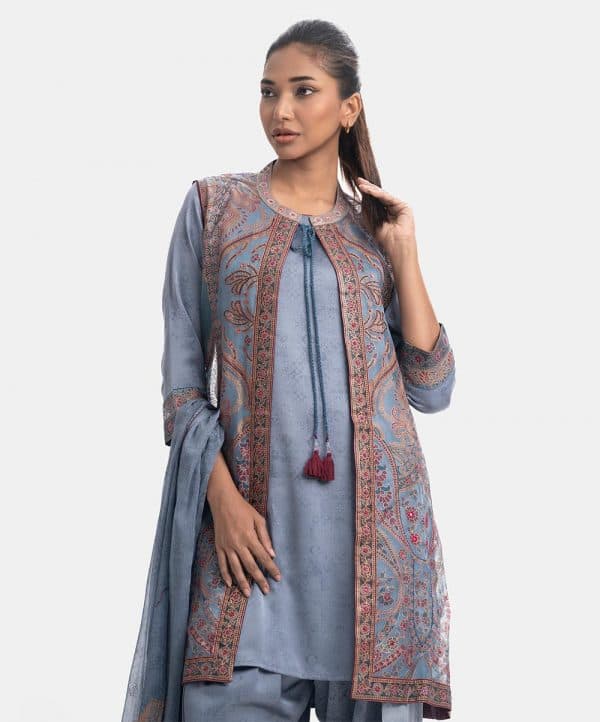 Women’s exclusive shrug style salwar kameez in Nargisus by Le Reve. Muslin fabric front part is sleeveless, open front, heavy karchupi detail shrug. Boat neck, three-quarter sleeves short style kameez. With a chiffon dupatta & classic pajama.