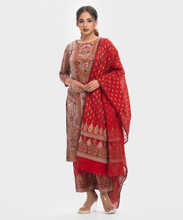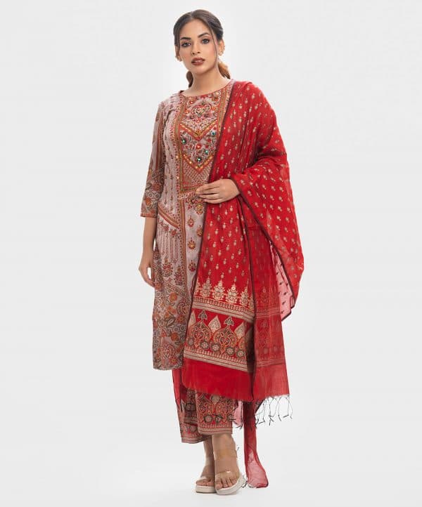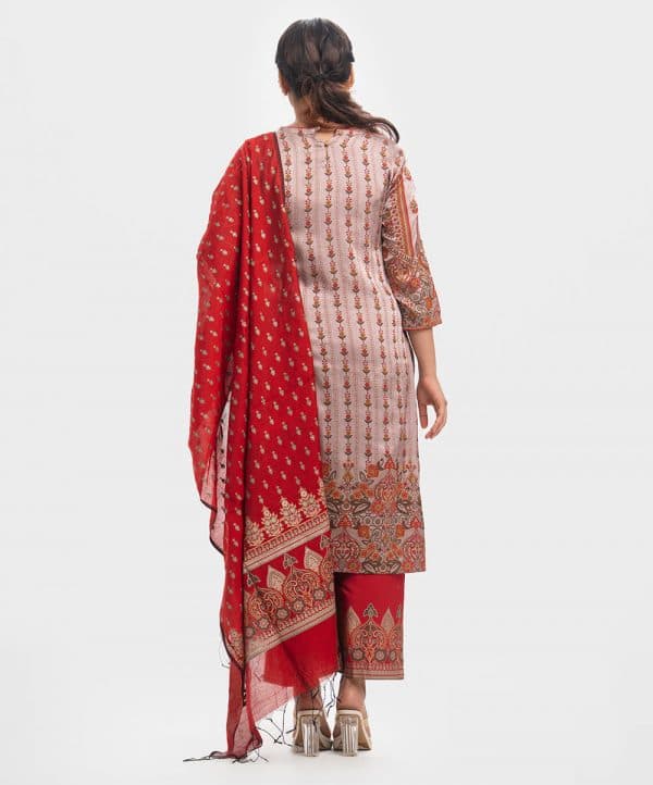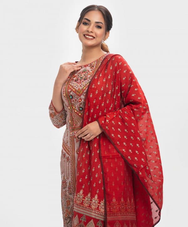 Women’s printed salwar kameez in textured georgette fabric. Round neck, three-quarter sleeves and karchupi at the front of kameez. Half-silk dupatta with cotton & silk blended fabric palazzo pants.