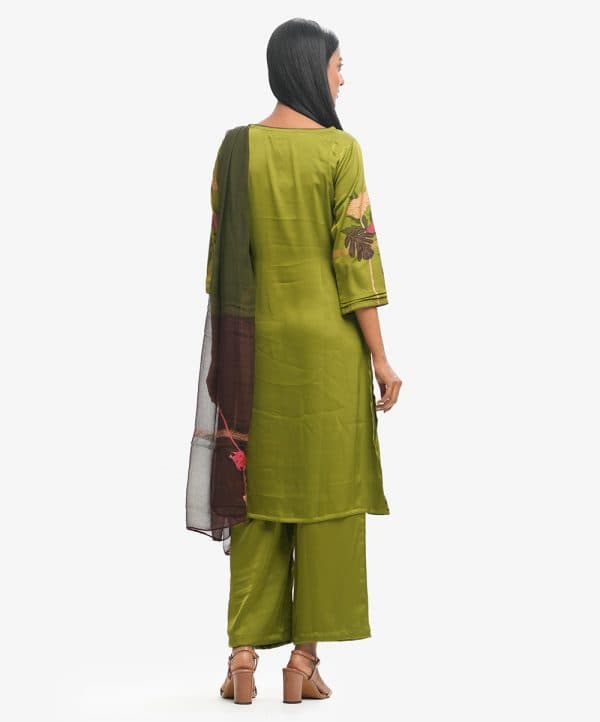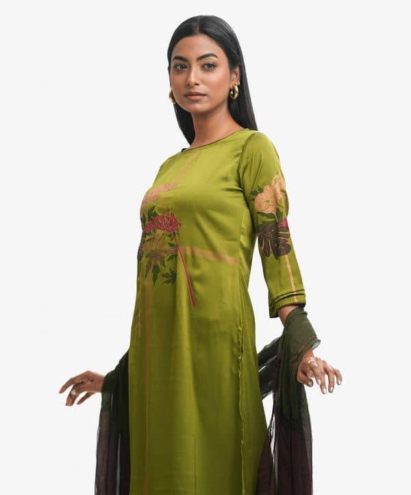 Long salwar kameez set in satin-georgette fabric. Round neck kameez with three-quarter sleeves, stitched at the front. Straight cut palazzo pant with a matching dupatta.