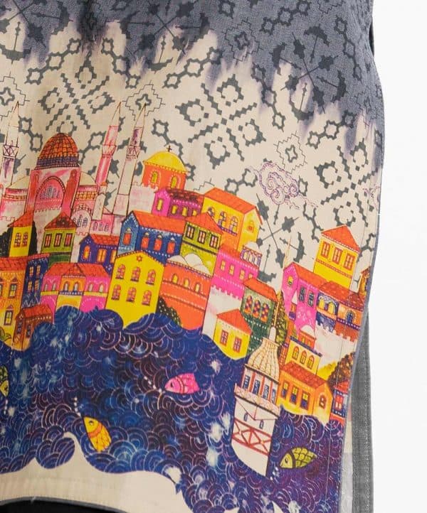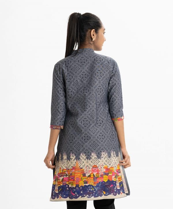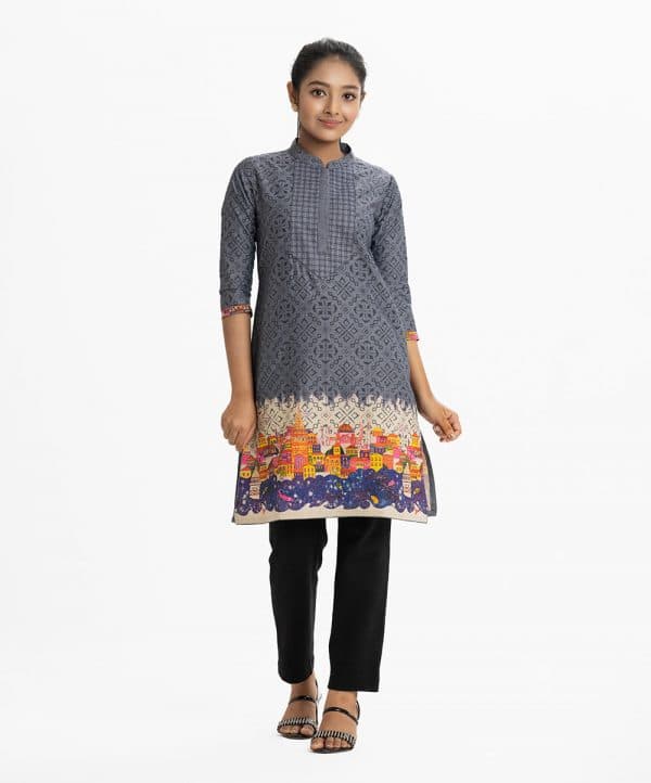 Teen girl printed straight kameez in chambray fabric. Mandarin collar, three-quarter sleeved. Line stitching at the front and bruges print at the hemline.