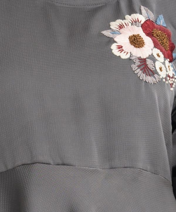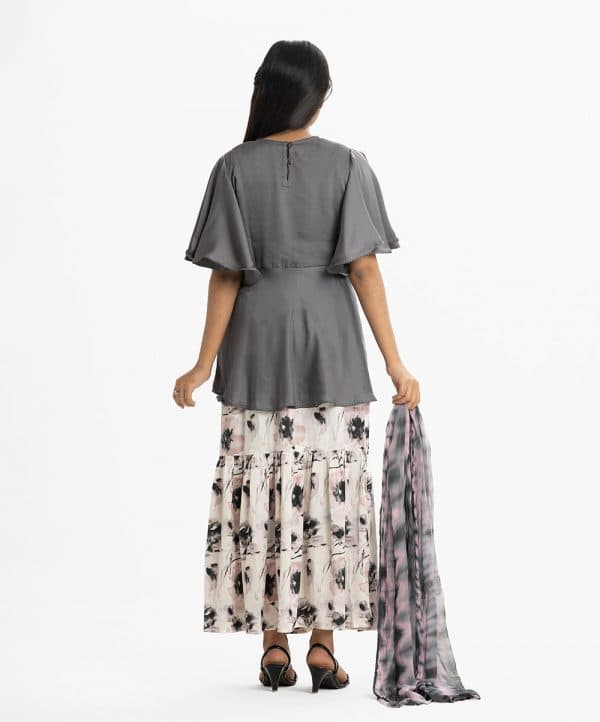 Teen girl’s skirt top set in crepe and georgette fabric. Round neck, butterfly-sleeved peplum-style top. Embroidery and karchupi at the top front. Complemented with tiered skirt and tie-dye printed chiffon dupatta.